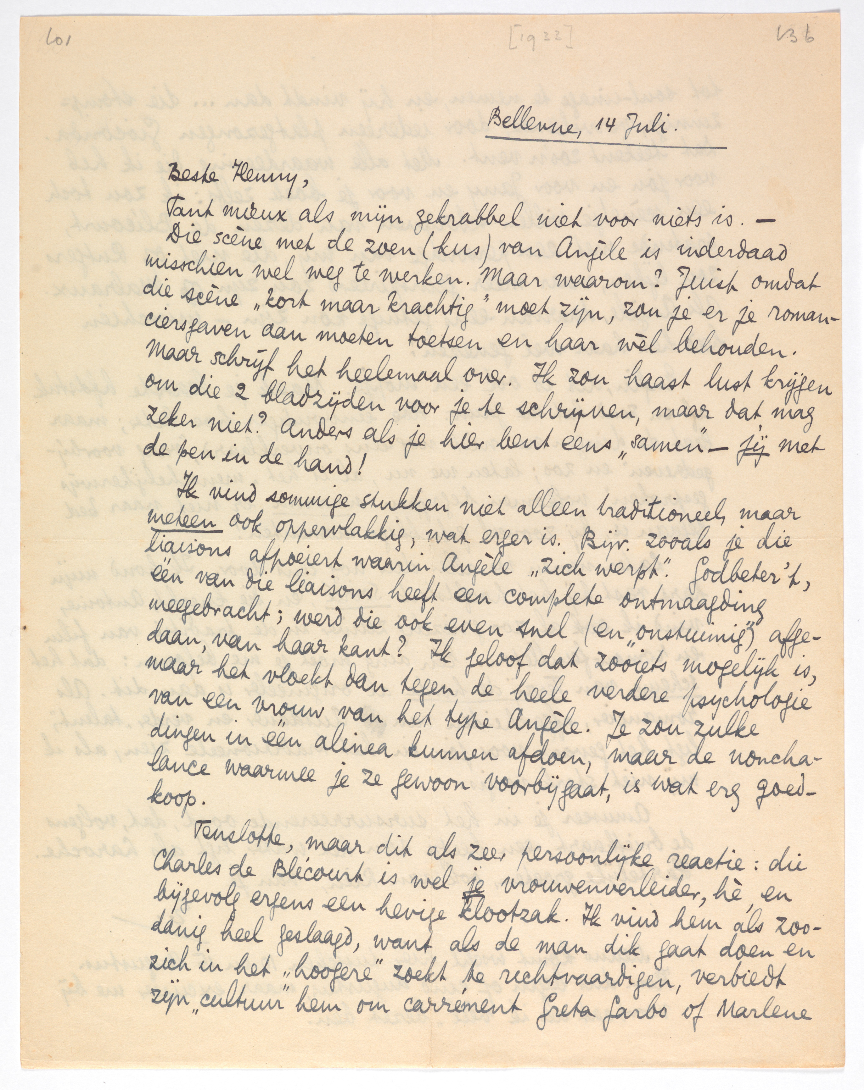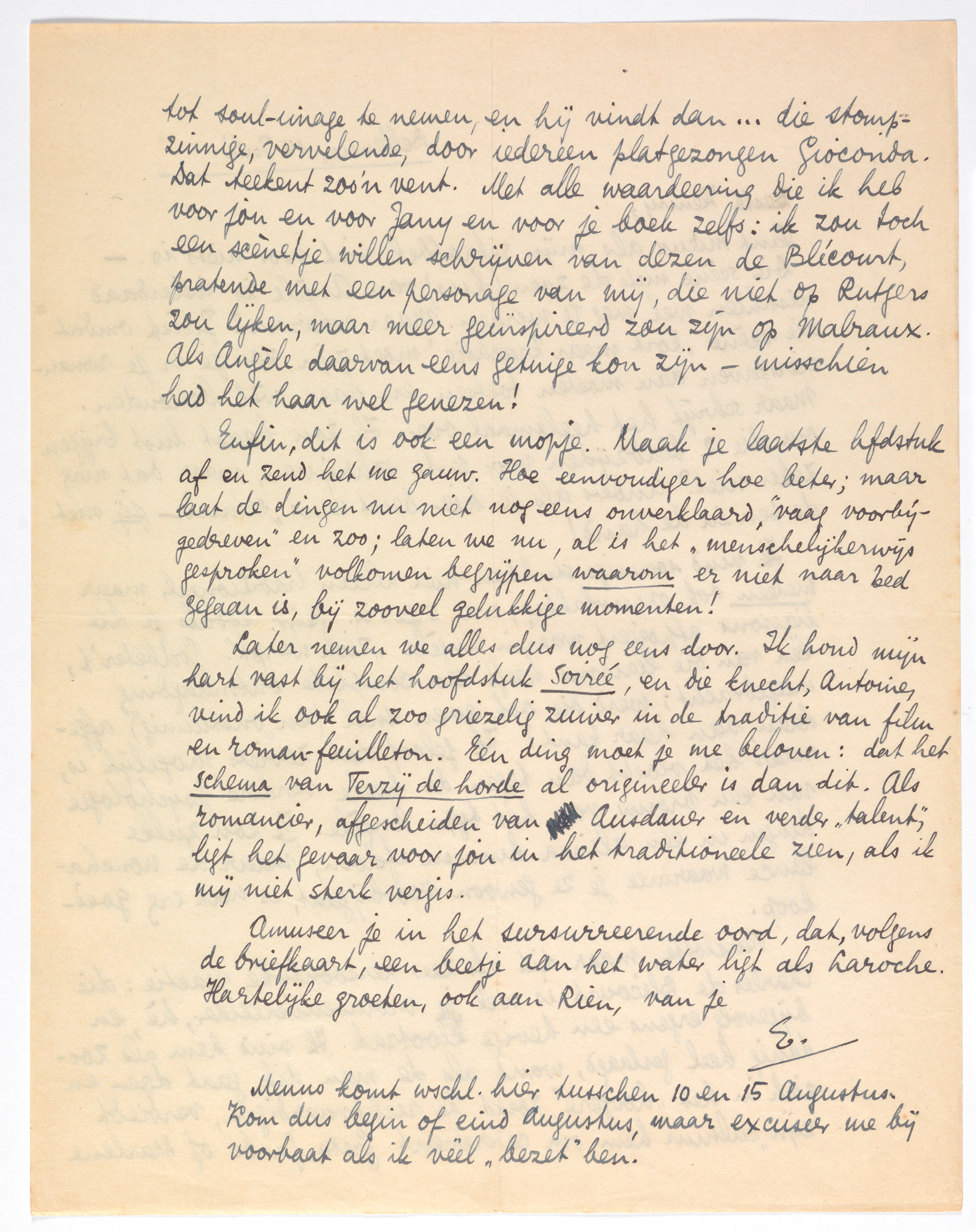 Tenslotte, maar dit als zeer persoonlijke reactie: die Charles de Blécourt is wel je vrouwenverleider, hè, en bijgevolg ergens een hevige klootzak. Ik vind hem als zoodanig heel geslaagd, want als de man dik gaat doen en zich in het ‘hoogere’ zoekt te rechtvaardigen, verbiedt zijn ‘cultuur’ hem om carrément Greta Garbo of Marlene tot soul-image te nemen, en hij vindt dan... die stompzinnige, vervelende, door iedereen platgezongen Gioconda. Dat teekent zoo'n vent. Met alle waardeering die ik heb voor jou en voor Jany en voor je boek zelfs: ik zou toch een scènetje willen schrijven van dezen de Blécourt, pratende met een personage van mij, die niet op Rutgers zou lijken, maar meer geïnspireerd zou zijn op Malraux. Als Angèle daarvan eens getuige kon zijn - misschien had het haar wel genezen!