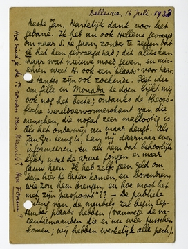 Beste Jan, Hartelijk dank voor het gedane. Ik heb nu ook Hellens gevraagd om naar S. te gaan, zonder te zeggen dat ik het hem gevraagd had; dit alles kan haar wat nieuwe moed geven, en misschien weet H. ook een ‘plaats’ voor haar. De tantes zijn ook zoekende. Het idee om Gille in Monada te doen lijkt mij ook nog het beste; ondanks de theosofische wereldvervormerskant van die menschen, die nogal zeer mallootig is. Als het onderwijs nu maar deugt. Als Jan Gr. terug is, kan hij daarnaar even informeeren, en als hem dat behoorlijk lijkt, moet de arme jongen er maar gauw heen. Ik heb zelfs geen geld om hem hier te laten komen, en bovendien, wie zou hem brengen, en hoe moet het met zijn ‘paspoort’?? - De publieke veiling van de meubels zal begin September plaats hebben (vanwege de vacantiemaanden die er nu weer tusschen komen; wij hebben werkelijk alle pech). De meubels zijn getaxeerd op 44.000 frs., de juweelen op 53.000 - maar moeten die ook publiek geveild worden? dat lijkt mij nogal kras! - Tesamen dus een kleine 100.000 frs., waarvan direct ± 70.000 schuld afgaat + wat de huisbaas nog krijgt + de notarissen; summa summarum dus: nihil. Precies wat wij dachten. Maar de juweelen lijken mij zeer laag getaxeerd; ik vertrouw dat nog niet erg. - Nu nog wat er uit Holland komt en dan is de boel afgedaan. Ik spuug ervan. - Hartelijke groeten en nogmaals dank.