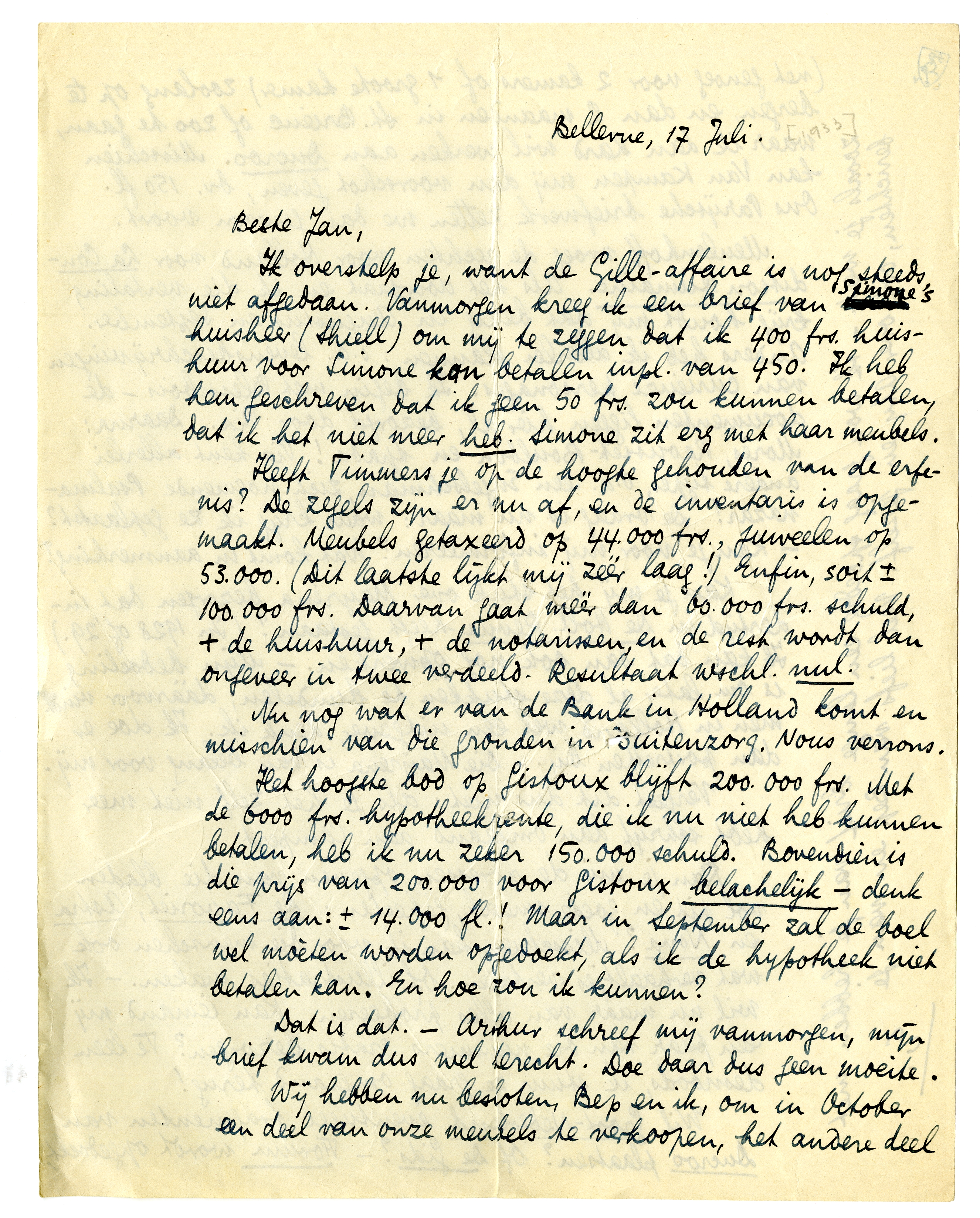 Ik overstelp je, want de Gille-affaire is nog steeds niet afgedaan. Vanmorgen kreeg ik een brief van Simone's huisheer (Shiell) om mij te zeggen dat ik 400 frs. huishuur voor Simone kan betalen inpl. van 450. Ik heb hem geschreven dat ik geen 50 frs. zou kunnen betalen, dat ik het niet meer heb. Simone zit erg met haar meubels.