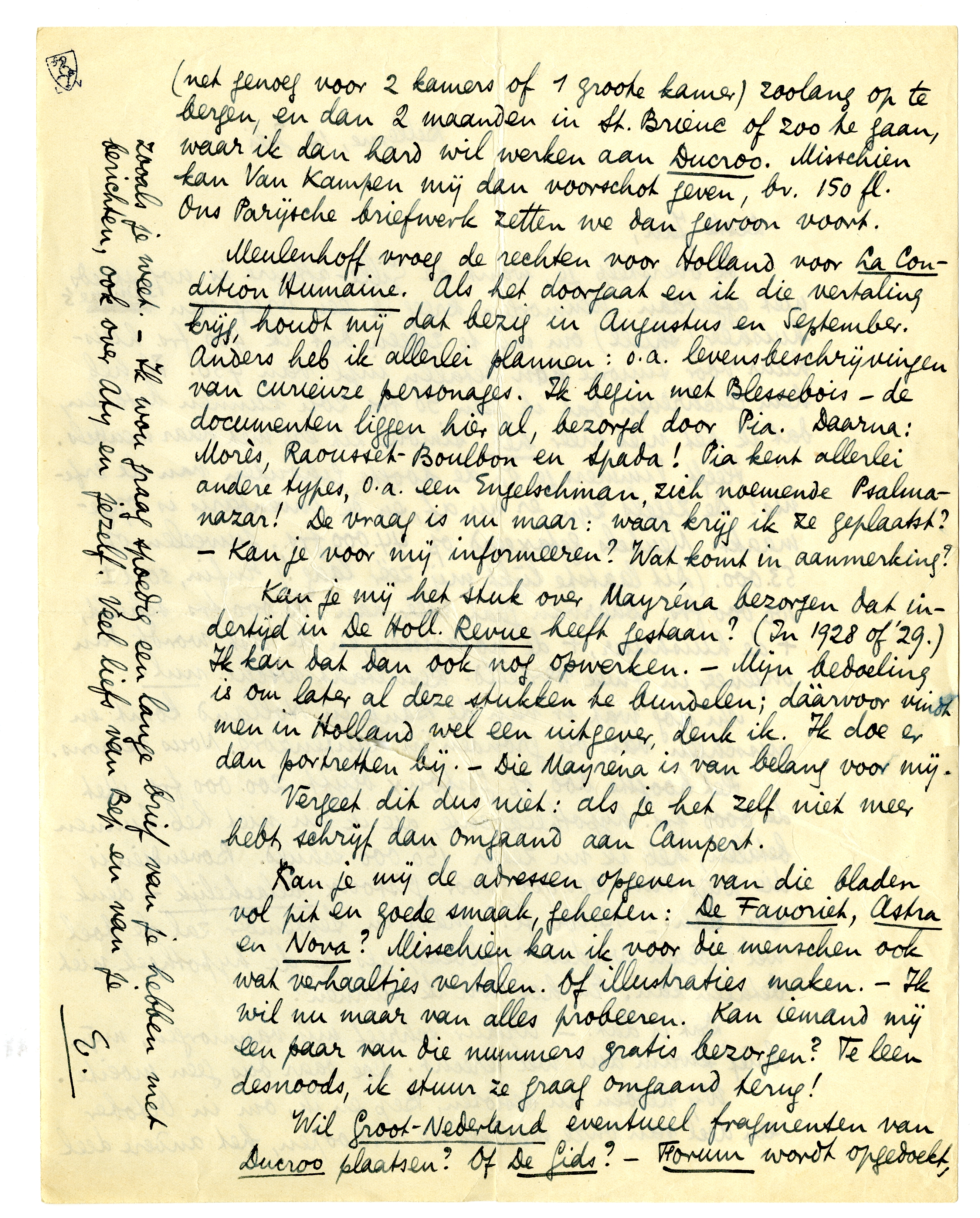 Kan je mij de adressen opgeven van die bladen vol pit en goede smaak, geheeten: De Favoriet, Astra en Nova? Misschien kan ik voor die menschen ook wat verhaaltjes vertalen. Of illustraties maken. - Ik wil nu maar van alles probeeren. Kan iemand mij een paar van die nummers gratis bezorgen? Te leen desnoods, ik stuur ze graag omgaand terug!