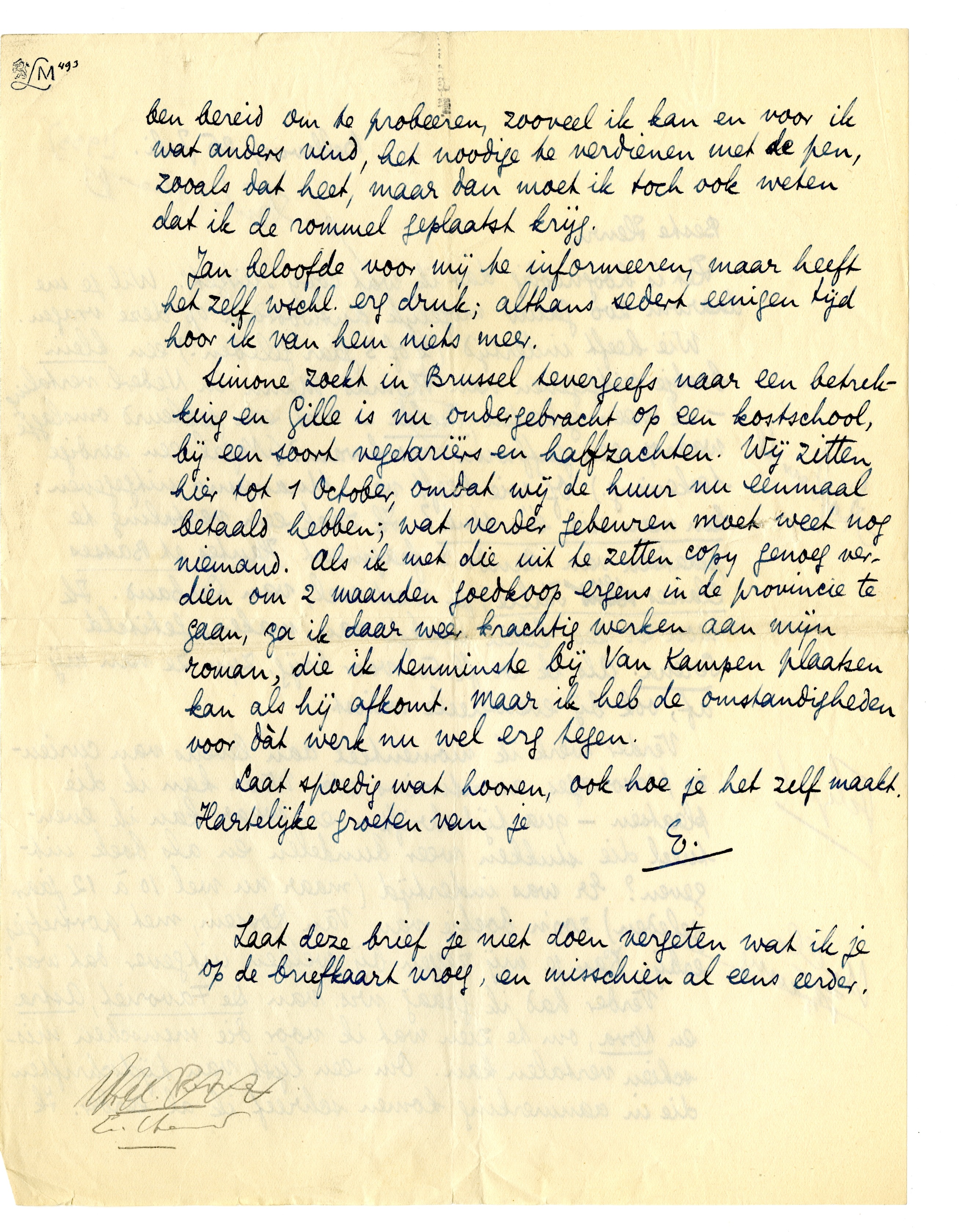 Simone zoekt in Brussel tevergeefs naar een betrekking en Gille is nu ondergebracht op een kostschool, bij een soort vegetariërs en halfzachten. Wij zitten hier tot 1 October, omdat wij de huur nu eenmaal betaald hebben; wat verder gebeuren moet weet nog niemand. Als ik met die uit te zetten copy genoeg verdien om 2 maanden goedkoop ergens in de provincie te gaan, ga ik daar weer krachtig werken aan mijn roman, die ik tenminste bij Van Kampen plaatsen kan als hij afkomt. Maar ik heb de omstandigheden voor dàt werk nu wel erg tegen.