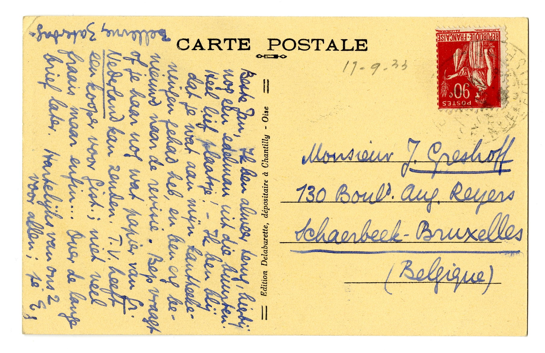 Beste Jan, Ik ben alweer terug, hierbij nog een edelman uit die buurten. Heel lief plaatsje! - Ik ben blij dat je wat aan mijn kantteekeningen gehad heb, en ben erg benieuwd naar de revisie. Bep vraagt of je haar nog wat papier van Gr. Nederland kan zenden. T.V. heeft een kooper voor Gist.; niet veel fraais maar enfin... Over de lange brief later.