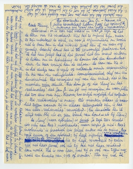 Allereerst: er is zeer veel waars in wat je zegt. Ik heb de blzn. over Vic verscheurd. Niet dat ze onjuist zijn, maar ze zijn inderdaad te sterk, en voor je argumentatie om zooiets niet te doen dan in het uiterste geval ben ik nu weer erg gevoelig. Daarbij komt dat ik Vic persoonlijk geschreven heb. Ik heb hem gezegd dat ik het gevoel heb een vriend verloren te hebben om in betrekking te komen tot een kunstredacteur. En daar wringt hem de schoen. De toon van Vic is in het stukje van 10 regels op voldoende manier superieur èn die van een welingelichte: tooneelspecialist, chef van de kunstrubriek. Het verwijdert mij van den vriend; dat is dan misschien mijn schuld. Hier kom je op die ‘hang’ en dat ‘rechterschap’ dat Jan Gr. en jij mij verwijten, en waar jullie het zoo eens over zijn. Hierover, zoo eerlijk mogelijk, het volgende.