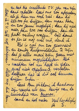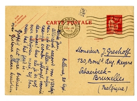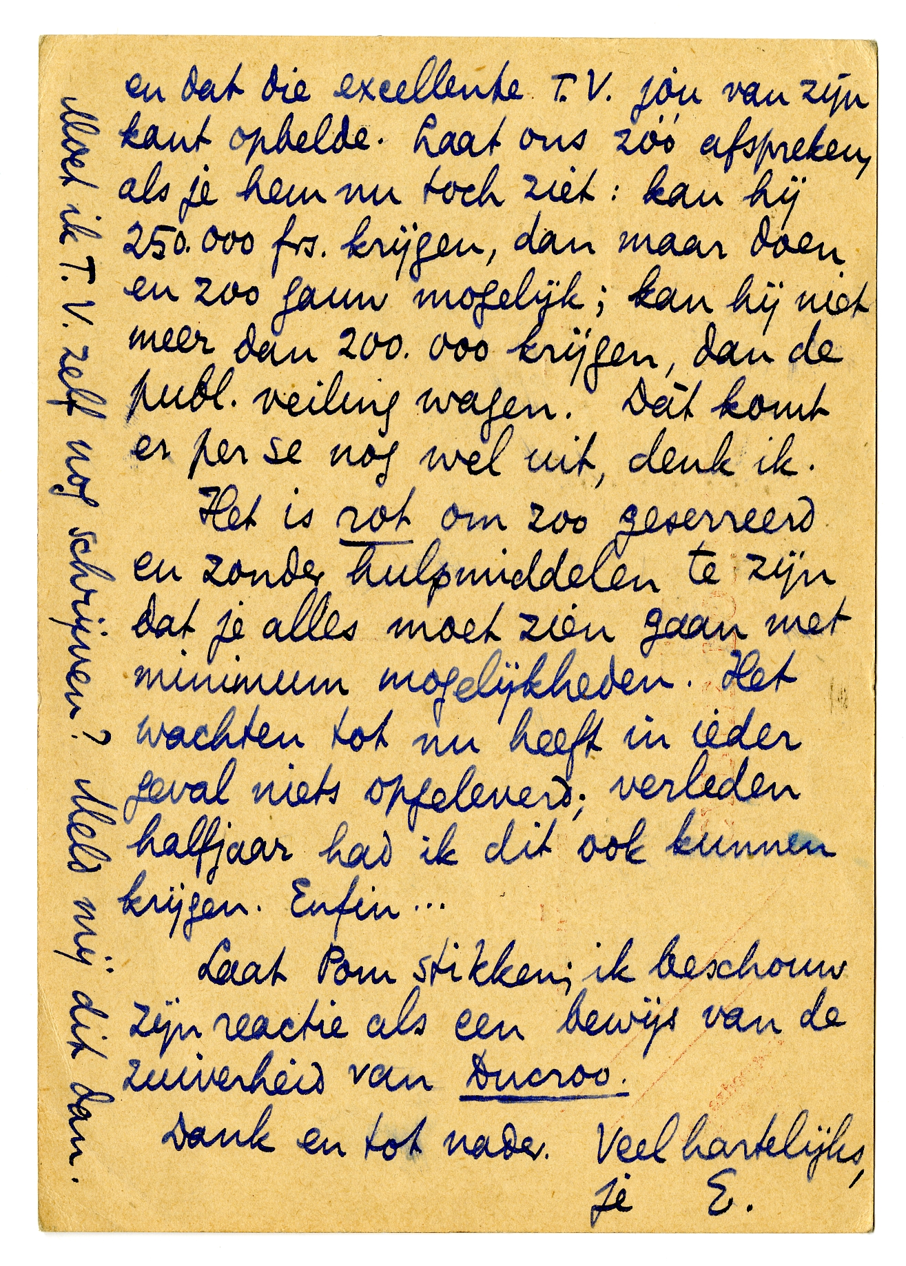 Grappig dat onze brieven over Gistoux elkaar kruisten en dat die excellente T.V. jou van zijn kant opbelde. Laat ons zóó afspreken, als je hem nu toch ziet: kan hij 250.000 frs. krijgen, dan maar doen en zoo gauw mogelijk; kan hij niet meer dan 200.000 krijgen, dan de publ. veiling wagen. Dàt komt er per se nog wel uit, denk ik.
