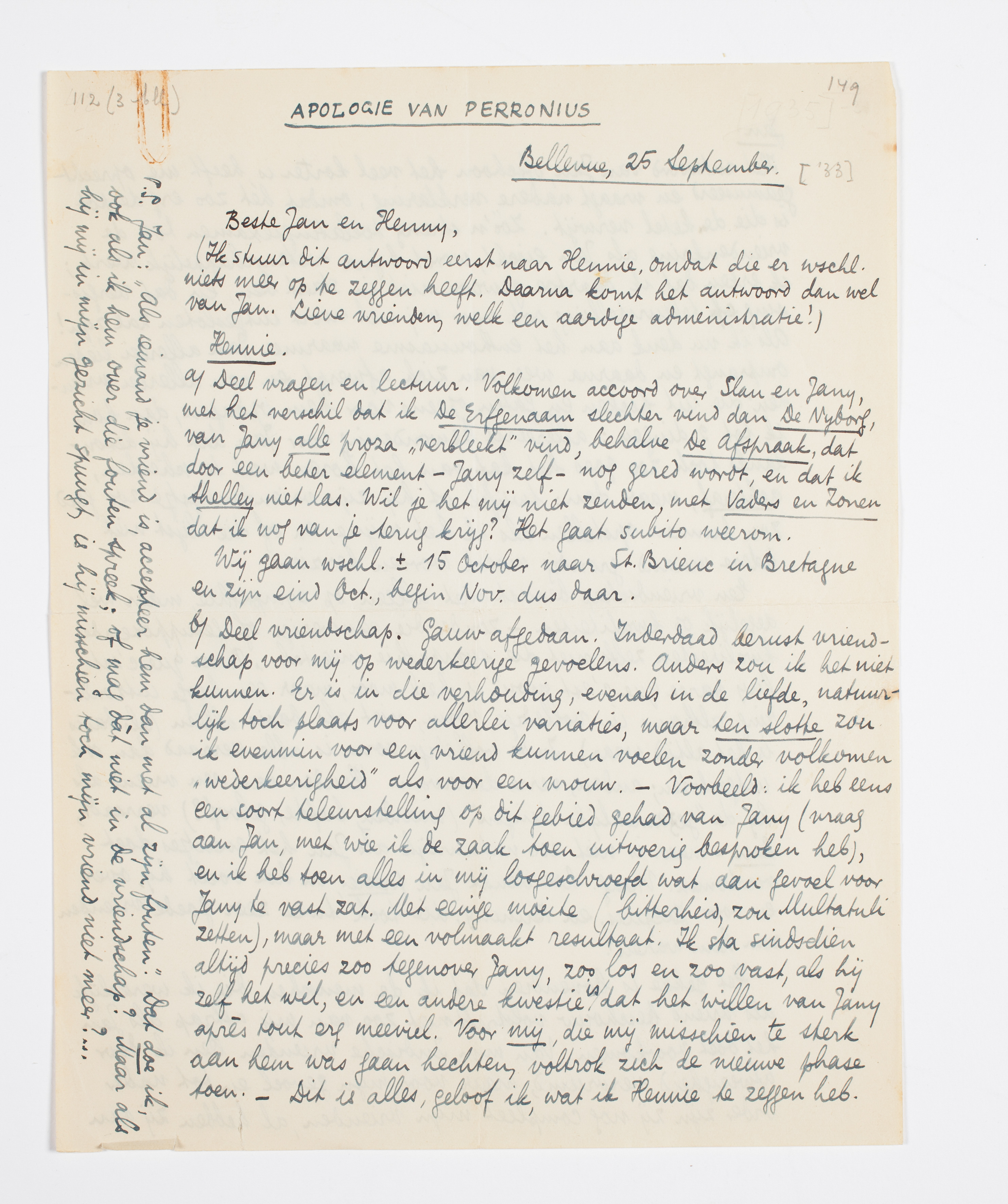 Het gekke is bovendien dat ik de menschen die ik werkelijk als vriend beschouw volstrekt niet zoo van mij aftrap als Jan het doet voorkomen. Van mijn Indische vrienden ben ik door afwezigheid vervreemd, maar voor mijn gevoel en tot nader order zijn zij nog compleet mijn vrienden, al hebben zij aan een groot stuk van mijn leven - het intellectueele - wschl. volstrekt geen deel meer. Hier dus zuiver een kwestie van gevoel, zooals Hennie dat wilde, of liever: jullie allebei.
