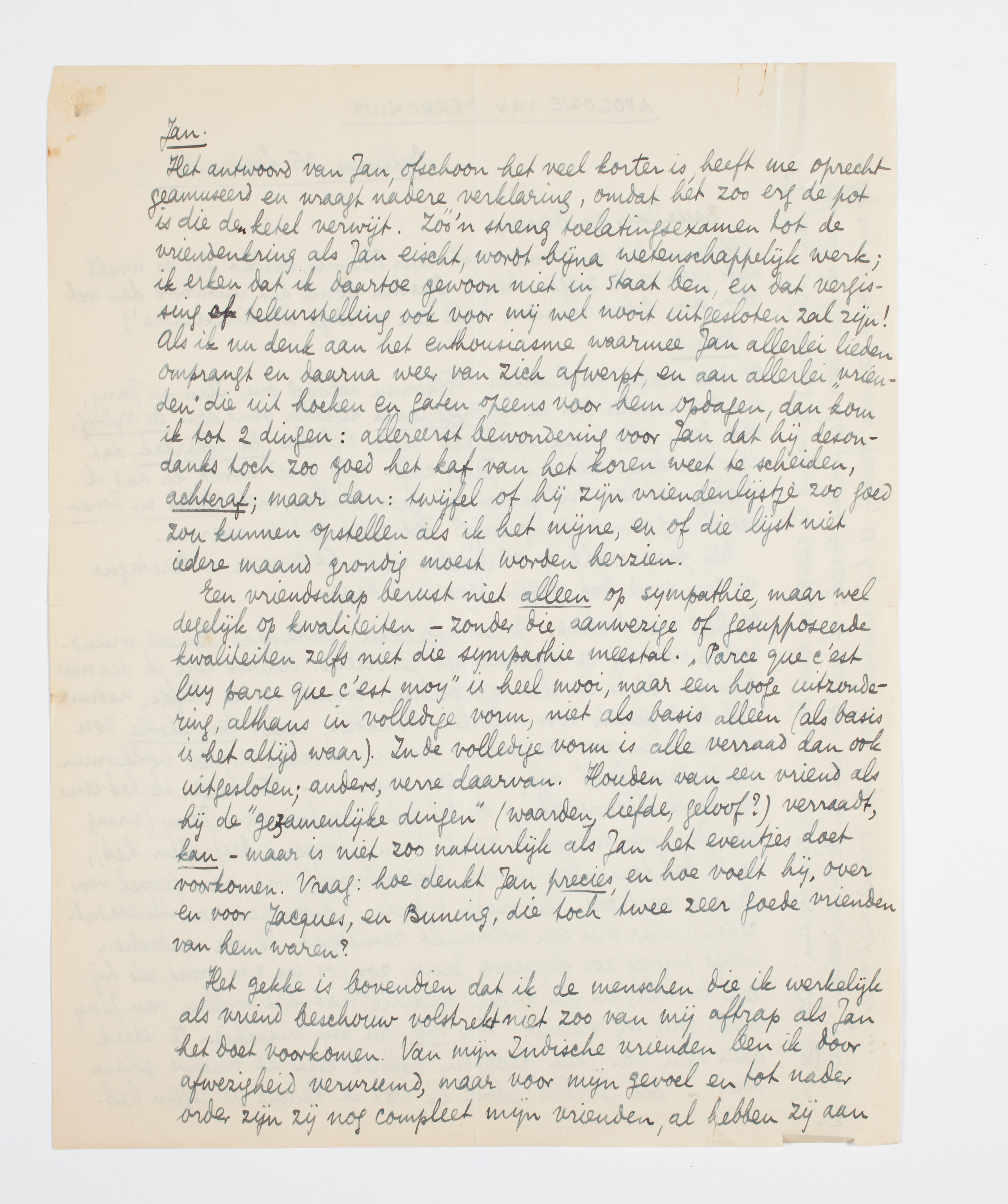 Een vriendschap berust niet alleen op sympathie, maar wel degelijk op kwaliteiten - zonder die aanwezige of gesupposeerde kwaliteiten zelfs niet die sympathie meestal. ‘Parce que c'est luy parce que c'est moy’ is heel mooi, maar een hoge uitzondering, althans in volledige vorm, niet als basis alleen (als basis is het altijd waar). In de volledige vorm is alle verraad dan ook uitgesloten; anders, verre daarvan. Houden van een vriend als hij de ‘gezamenlijke dingen’ (waarden, liefde, geloof?) verraadt, kan - maar is niet zoo natuurlijk als Jan het eventjes doet voorkomen. Vraag: hoe denkt Jan precies, en hoe voelt hij, over en voor Jacques, en Buning, die toch twee zeer goede vrienden van hem waren?