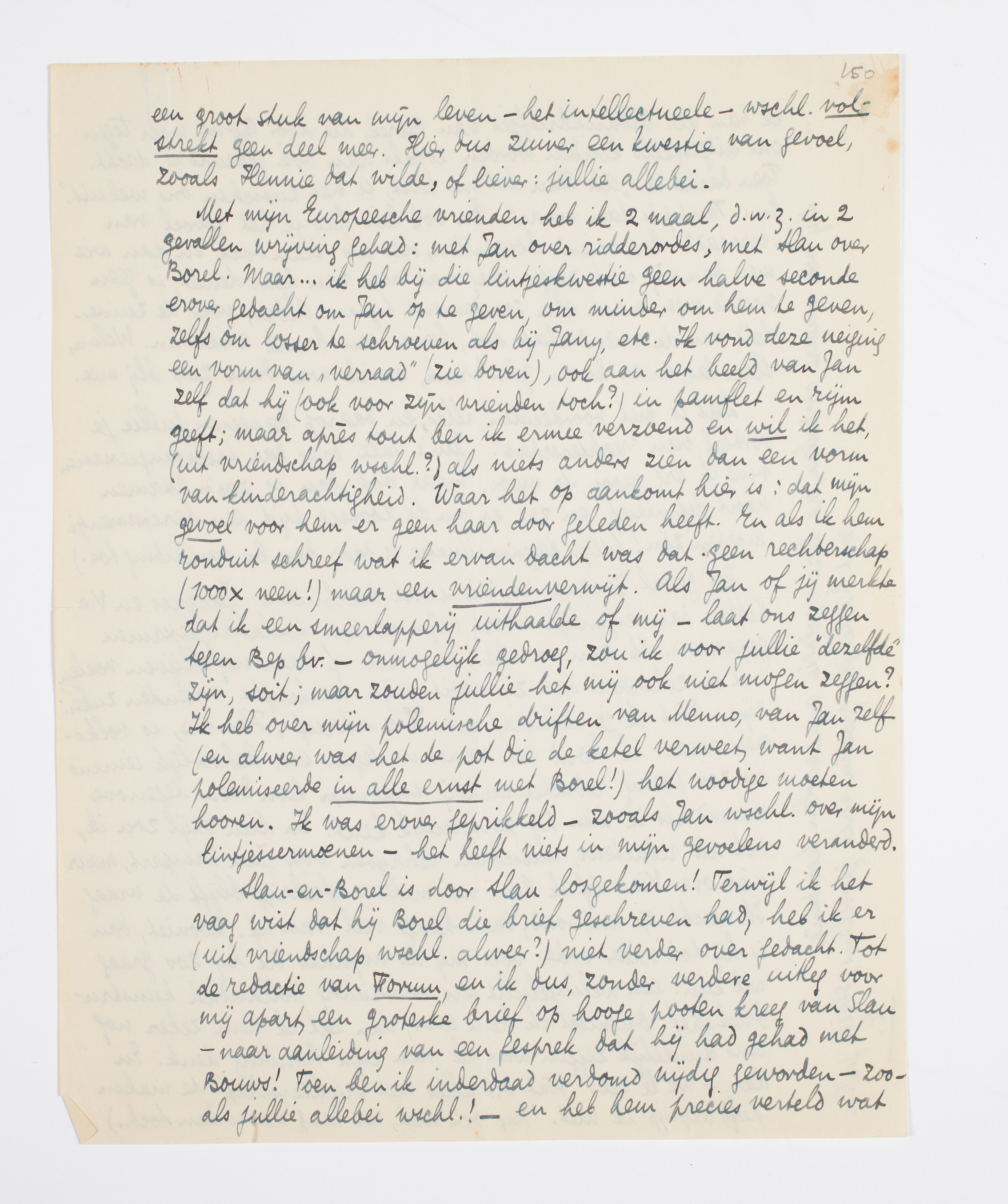 Met mijn Europeesche vrienden heb ik 2 maal, d.w.z. in 2 gevallen wrijving gehad: met Jan over ridderordes, met Slau over Borel. Maar... ik heb bij die lintjeskwestie geen halve seconde erover gedacht om Jan op te geven, om minder om hem te geven, zelfs om losser te schroeven als bij Jany, etc. Ik vond deze neiging een vorm van ‘verraad’ (zie boven), ook aan het beeld van Jan zelf dat hij (ook voor zijn vrienden toch?) in pamflet en rijm geeft; maar après tout ben ik ermee verzoend en wil ik het, (uit vriendschap wschl.?) als niets anders zien dan een vorm van kinderachtigheid. Waar het op aankomt hier is: dat mijn gevoel voor hem er geen haar door geleden heeft. En als ik hem ronduit schreef wat ik ervan dacht was dat geen rechterschap (1000 × neen!) maar een vrienden verwijt. Als Jan of jij merkte dat ik een smeerlapperij uithaalde of mij - laat ons zeggen tegen Bep bv. - onmogelijk gedroeg, zou ik voor jullie ‘dezelfde’ zijn, soit; maar zouden jullie het mij ook niet mogen zeggen? Ik heb over mijn polemische driften van Menno, van Jan zelf (en alweer was het de pot die de ketel verweet, want Jan polemiseerde in alle ernst met Borel!) het noodige moeten hooren. Ik was erover geprikkeld - zooals Jan wschl. over mijn lintjessermoenen - het heeft niets in mijn gevoelens veranderd.