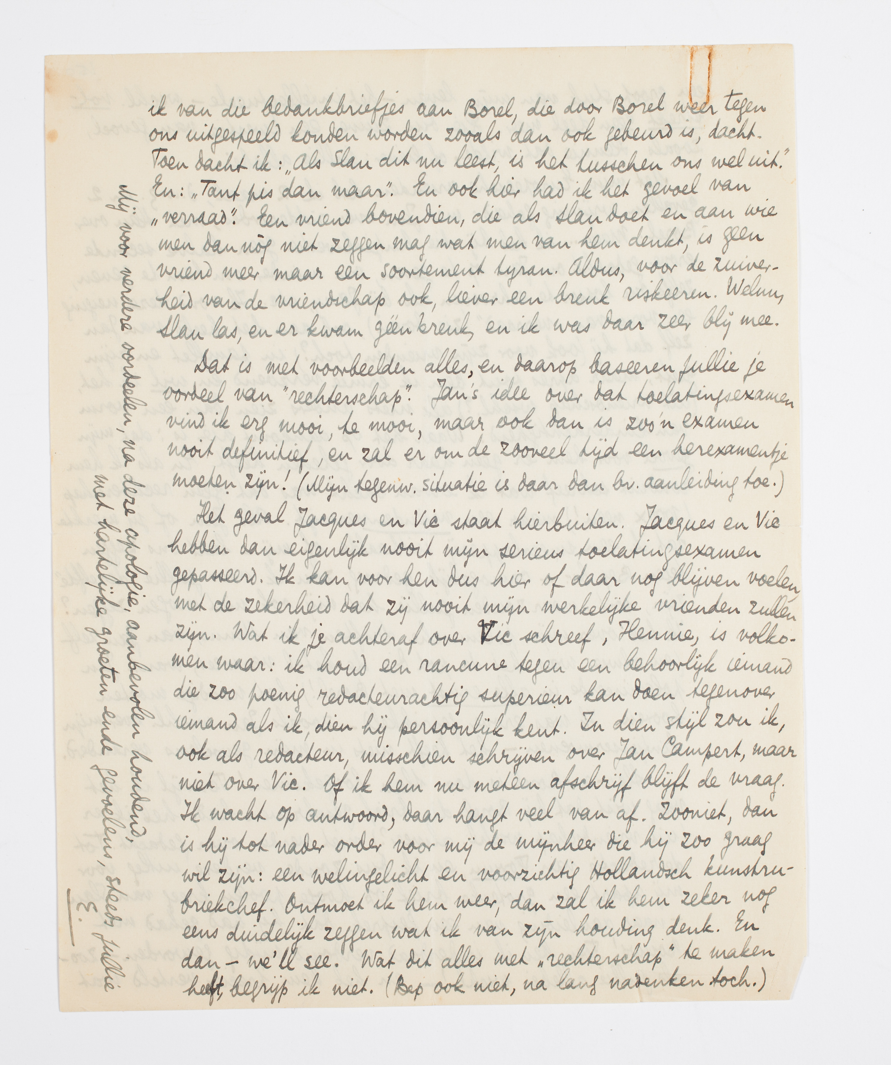 Het geval Jacques en Vic staat hierbuiten. Jacques en Vic hebben dan eigenlijk nooit mijn serieus toelatingsexamen gepasseerd. Ik kan voor hen dus hier of daar nog blijven voelen, met de zekerheid dat zij nooit mijn werkelijke vrienden zullen zijn. Wat ik je achteraf over Vic schreef, Hennie, is volkomen waar: ik houd een rancune tegen een behoorlijk iemand die zoo poenig redacteurachtig superieur kan doen tegenover iemand als ik, dien hij persoonlijk kent. In dien stijl zou ik, ook als redacteur, misschien schrijven over Jan Campert, maar niet over Vic. Of ik hem nu meteen afschrijf blijft de vraag. Ik wacht op antwoord, daar hangt veel van af. Zooniet, dan is hij tot nader order voor mij de mijnheer die hij zoo graag wil zijn: een welingelicht en voorzichtig Hollandsch kunstrubriekchef. Ontmoet ik hem weer, dan zal ik hem zeker nog eens duidelijk zeggen wat ik van zijn houding denk. En dan - we'll see. Wat dit alles met ‘rechterschap’ te maken heeft, begrijp ik niet. (Bep ook niet, na lang nadenken toch.)
