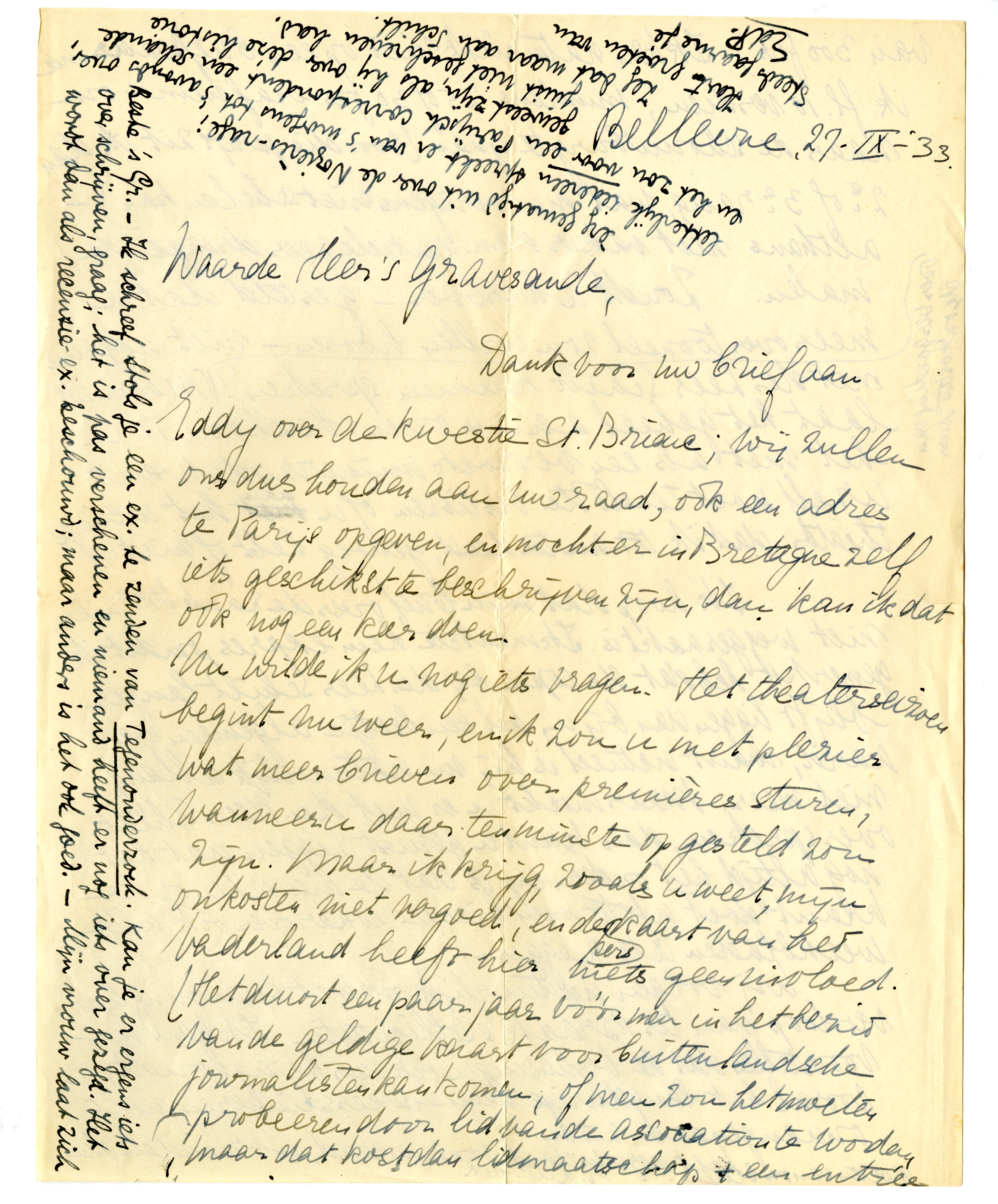 Nu wilde ik u nog iets vragen. Het theaterseizoen begint nu weer, en ik zou u met plezier wat meer brieven over premières sturen, wanneer u daar tenminste op gesteld zou zijn. Maar ik krijg, zooals u weet, mijn onkosten niet vergoed, en de perskaart van het Vaderland heeft hier niets geen invloed. (Het duurt een paar jaar vóór men in het bezit van de geldige kaart voor buitenlandsche journalisten kan komen, of men zou het moeten probeeren door lid van de Association te worden, maar dat kost dan lidmaatschap + een entrée van 300 frs.). Ik kan natuurlijk niet op een brief waarmee ik fl.10 verdien, minstens 25 of 30 frs. eraf nemen om naar de schouwburg te gaan (voor die prijs zit ik dan 2e of 3e rang, wat me overigens niet schelen kan) - althans niet vaker dan enkele zeer dringende malen. Zoudt u hierover - gesteld dat u meer over tooneel zou willen hooren - niet nog eens met den heer Schilt kunnen spreken? Over vergoeding van de onkosten dus. Maar ik laat het geheel aan u over: beschouwt u het niet als een verzoek mijnerzijds, want uzelf moet tenslotte beslissen of u aan het weinige theater dat ik tot nu toe deed, genoeg hebt of niet.