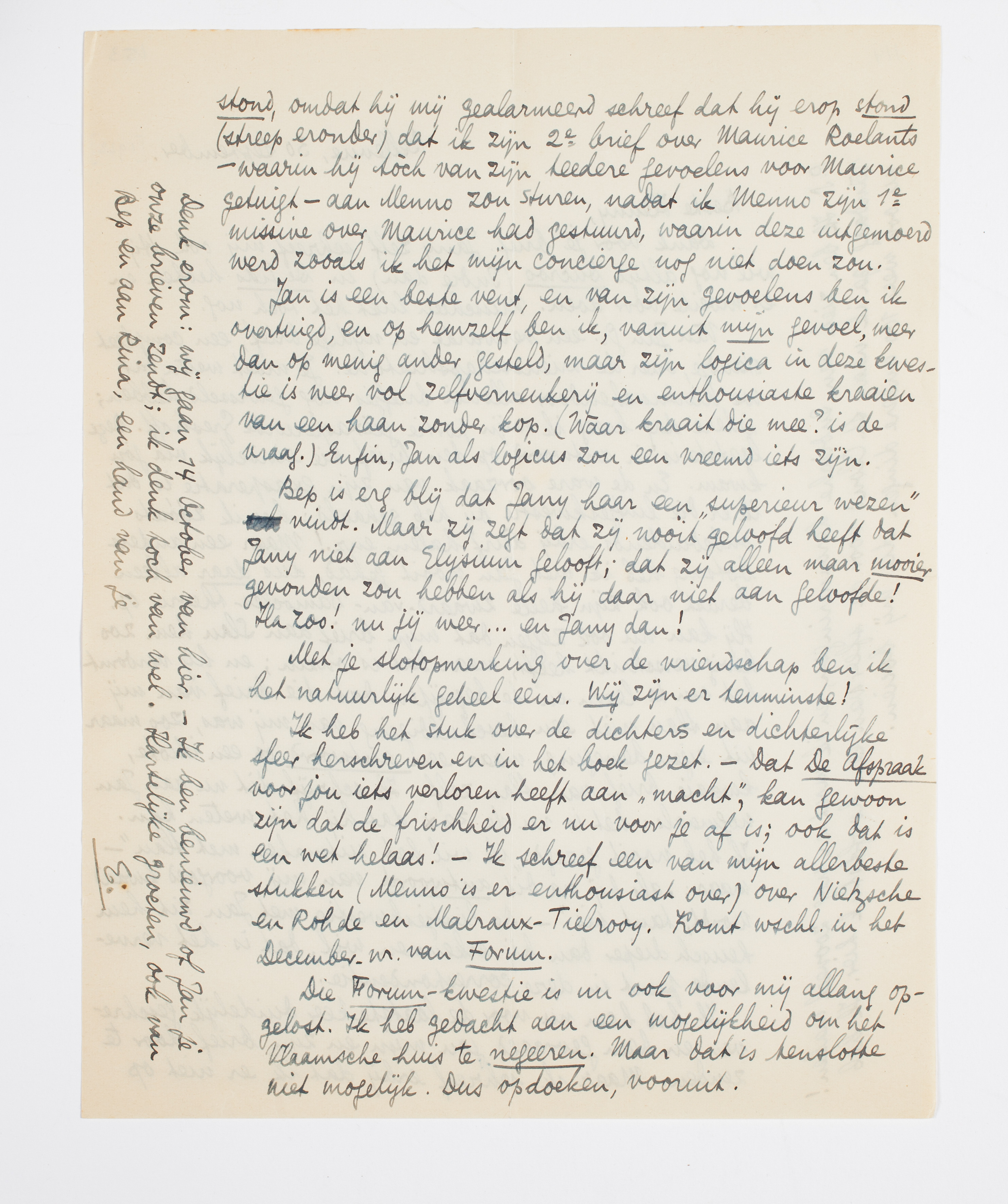 Ik heb het stuk over de dichters en dichterlijke sfeer herschreven en in het boek gezet. - Dat De Afspraak voor jou iets verloren heeft aan ‘macht’, kan gewoon zijn dat de frischheid er nu voor je af is; ook dat is een wet helaas! - Ik schreef een van mijn allerbeste stukken (Menno is er enthousiast over) over Nietzsche en Rohde en Malraux-Tielrooy. Komt wschl. in het December-nr. van Forum.