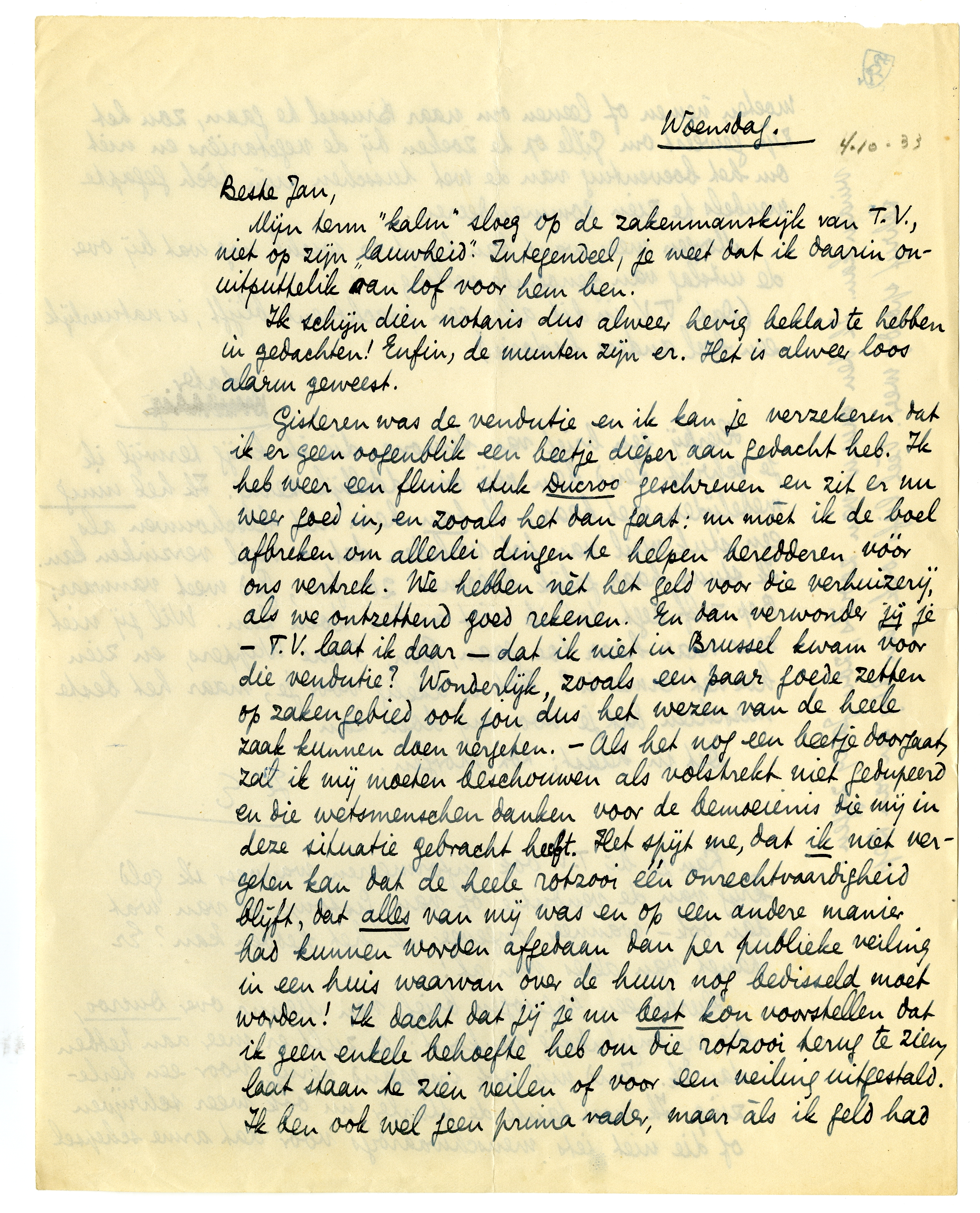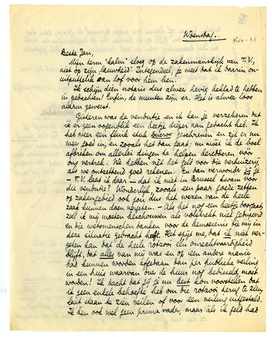 Gisteren was de vendutie en ik kan je verzekeren dat ik er geen oogenblik een beetje dieper aan gedacht heb. Ik heb weer een flink stuk Ducroo geschreven en zit er nu weer goed in, en zooals het dan gaat: nu moèt ik de boel afbreken om allerlei dingen te helpen beredderen vóór ons vertrek. We hebben nèt het geld voor die verhuizerij, als we ontzettend goed rekenen. En dan verwonder jij je - T.V. laat ik daar - dat ik niet in Brussel kwam voor die vendutie? Wonderlijk, zooals een paar goede zetten op zakengebied ook jou dus het wezen van de heele zaak kunnen doen vergeten. - Als het nog een beetje doorgaat, zal ik mij moeten beschouwen als volstrekt niet gedupeerd en die wetsmenschen danken voor de bemoeienis die mij in deze situatie gebracht heeft. Het spijt me, dat ik niet vergeten kan dat de heele rotzooi één onrechtvaardigheid blijft, dat alles van mij was en op een andere manier had kunnen worden afgedaan dan per publieke veiling in een huis waarvan over de huur nog bedisseld moet worden! Ik dacht dat jij je nu best kon voorstellen dat ik geen enkele behoefte heb om die rotzooi terug te zien, laat staan te zien veilen of voor een veiling uitgestald. Ik ben ook wel geen prima vader, maar àls ik geld had moeten nemen of leenen om naar Brussel te gaan, zou het zijn geweest om Gille op te zoeken bij de vegetariërs en niet om het boeventuig van de wet tusschen mijn tòch gegapte meubels te zien commandeeren.