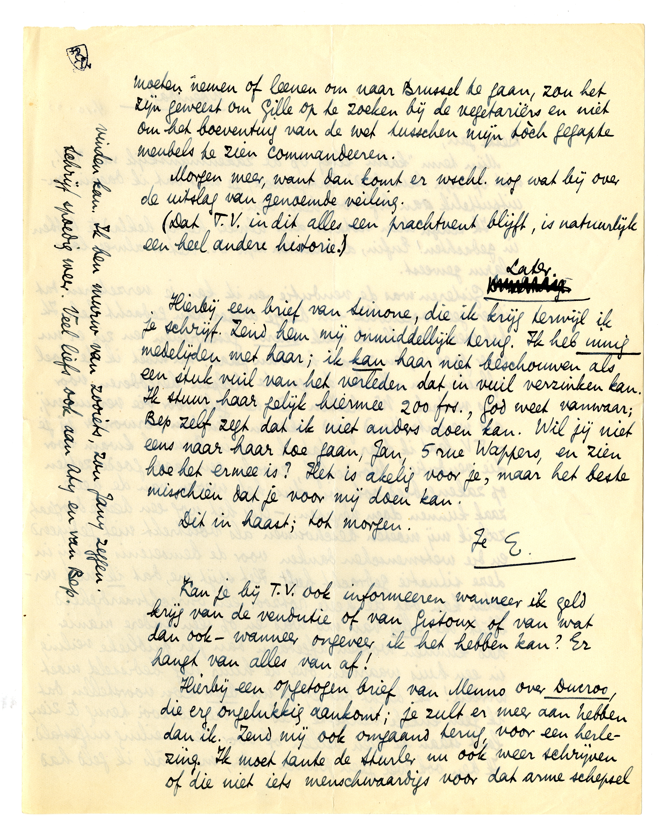 Hierbij een brief van Simone, die ik krijg terwijl ik je schrijf. Zend hem mij onmiddellijk terug. Ik heb innig medelijden met haar; ik kan haar niet beschouwen als een stuk vuil van het verleden dat in vuil verzinken kan. Ik stuur haar gelijk hiermee 200 frs. God weet vanwaar; Bep zelf zegt dat ik niet anders doen kan. Wil jij niet eens naar haar toe gaan, Jan, 5 rue Wappers, en zien hoe het ermee is? Het is akelig voor je, maar het beste misschien dat je voor mij doen kan.