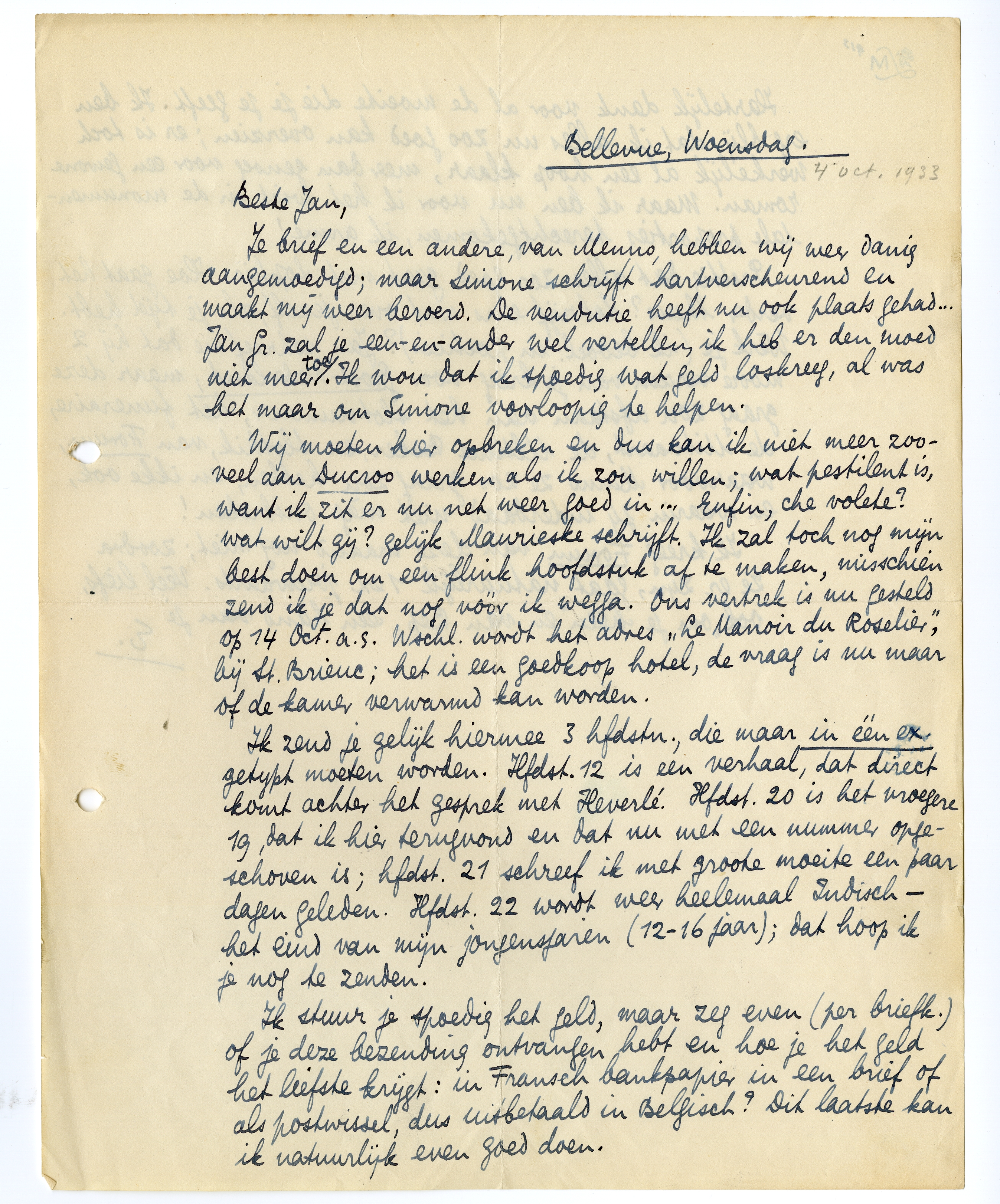 Wij moeten hier opbreken en dus kan ik niet meer zooveel aan Ducroo werken als ik zou willen; wat pestilent is, want ik zit er nu net weer goed in... Enfin, che volete? wat wilt gij? gelijk Maurieske schrijft. Ik zal toch nog mijn best doen om een flink hoofdstuk af te maken, misschien zend ik je dat nog vóór ik wegga. Ons vertrek is nu gesteld op 14 Oct. a.s. Wschl. wordt het adres ‘Le Manoir du Roselier’, bij St. Brieuc; het is een goedkoop hotel, de vraag is nu maar of de kamer verwarmd kan worden.