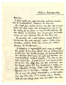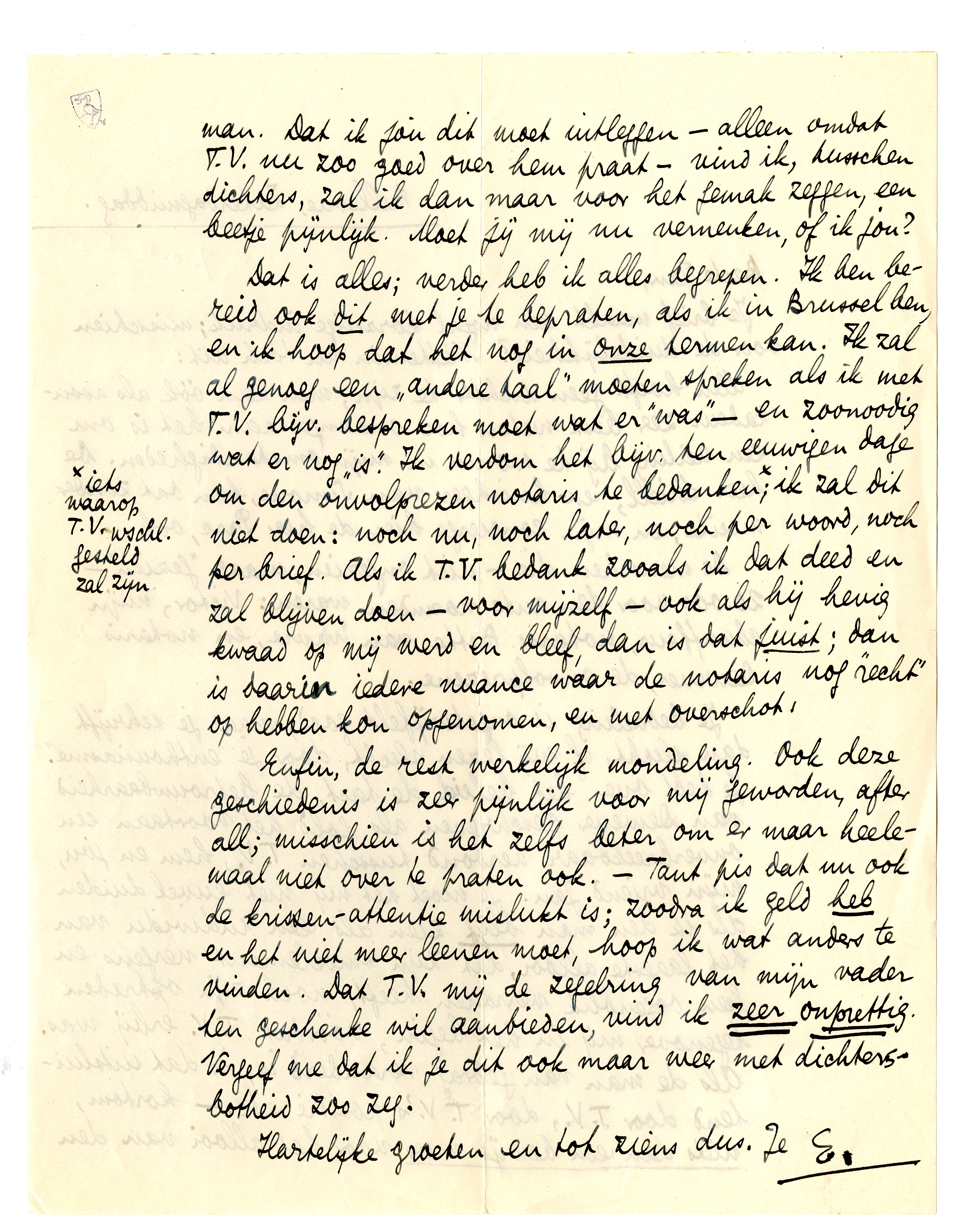 Dat is alles; verder heb ik alles begrepen. Ik ben bereid ook dit met je te bepraten, als ik in Brussel ben, en ik hoop dat het nog in onze termen kan. Ik zal al genoeg een ‘andere taal’ moeten spreken als ik met T.V. bijv. bespreken moet wat er ‘was’ - en zoonoodig wat er nog ‘is’. Ik verdom het bijv. ten eeuwigen dage om den onvolprezen notaris te bedanken;* ik zal dit niet doen: noch nu, noch later, noch per woord, noch per brief. Als ik T.V. bedank zooals ik dat deed en zal blijven doen - voor mijzelf - ook als hij hevig kwaad op mij werd en bleef, dan is dat juist; dan is daarin iedere nuance waar de notaris nog ‘recht’ op hebben kon opgenomen, en met overschot.