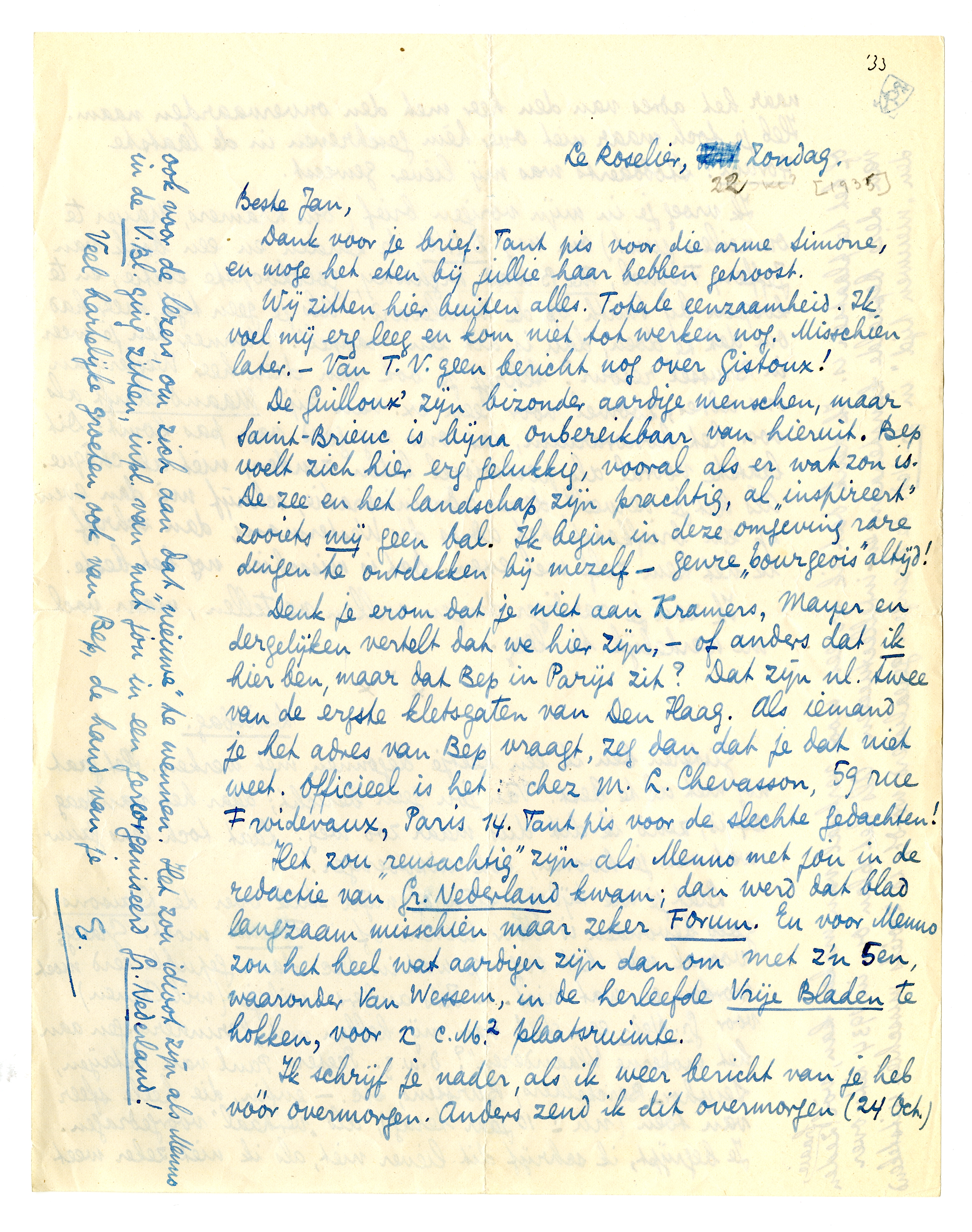 Laat je me tijdig weten of mijn stuk over de Liaisons goed bevonden is door Coenen of in Forum moet? Graag; vooral met het oog op wat in Dec. daar gepubliceerd moet worden en wat niet. - Iets anders: wil je (wil Coenen) voor Gr. Ned. een stuk van mij hebben met ‘herinneringen aan het moderne Vlaanderen’?2936 d.w.z. Peeters, Paul van Ostaijen, Seuphor-Berckelaers, Burssens, etc. - enfin, die heele sfeer van toen (nu ± 10 jaar terug), als ‘verhaal’ voorgedragen. Je begrijpt, ik schrijf dit liever niet, als ik niet zeker weet of het te plaatsen is. Ik denk dat ik er een mooi verhaal van maken kan, vòl fraaie zeden van deze bepaalde kunstenaars-en-intellectueelen. Als het plan om in 1934 iets over den ‘nieuwen tijd’ in Gr. Ned. te brengen gerealiseerd wordt, is zooiets misschien uitstekend ook voor de lezers, om zich aan dat ‘nieuwe’ te wennen. Het zou idioot zijn als Menno in de V. Bl. ging zitten, inpl. van met jou in een gereorganiseerd Gr. Nederland!