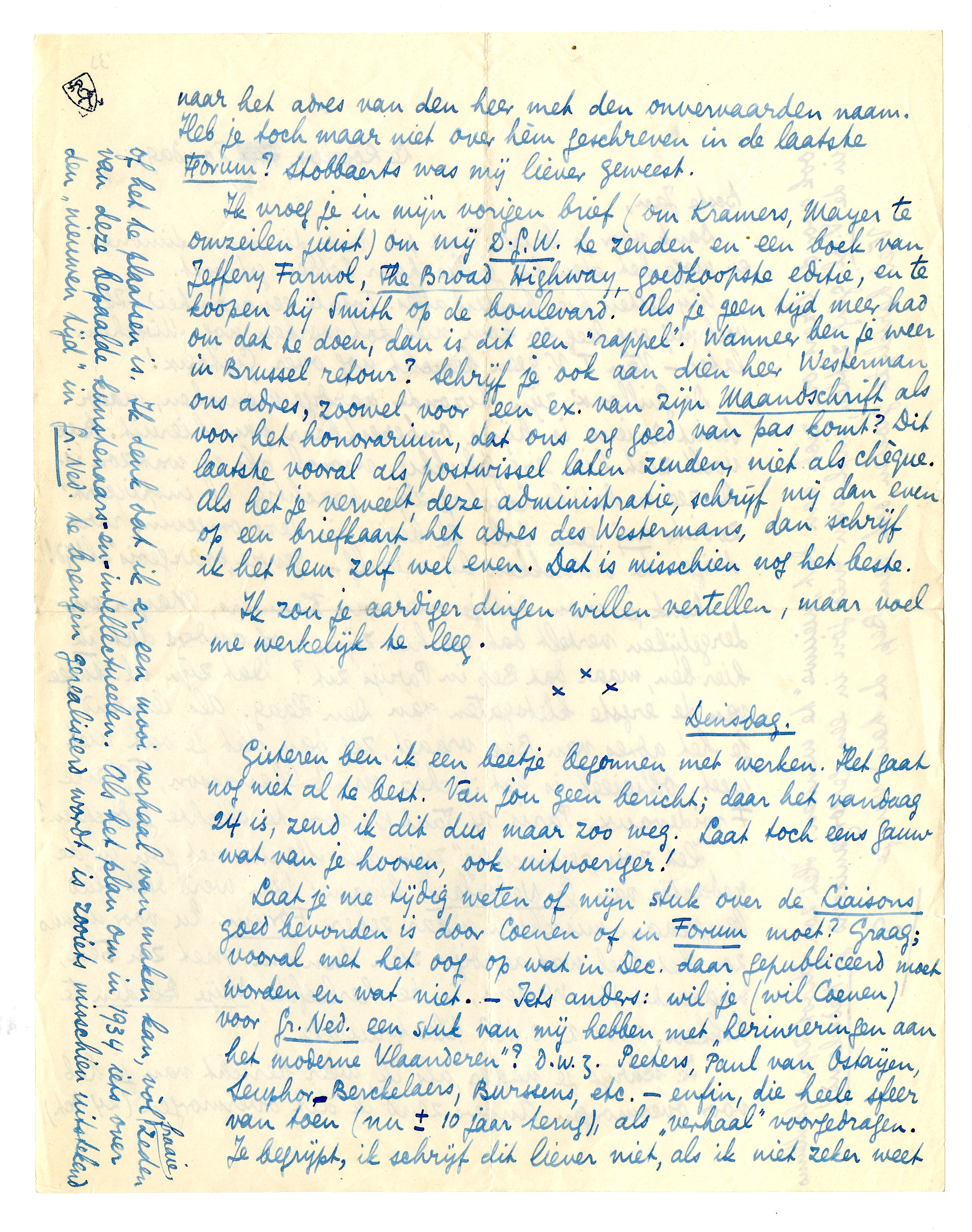 Ik vroeg je in mijn vorigen brief (om Kramers, Mayer te omzeilen juist) om mij D.G.W. te zenden en een boek van Jeffery Farnol, The Broad Highway, goedkoopste editie, en te koopen bij Smith op de boulevard. Als je geen tijd meer had om dat te doen, dan is dit een ‘rappel’. Wanneer ben je weer in Brussel retour? Schrijf je ook aan dien heer Westerman ons adres, zoowel voor een ex. van zijn Maandschrift als voor het honorarium, dat ons erg goed van pas komt? Dit laatste vooral als postwissel laten zenden, niet als chèque. Als het je verveelt, deze administratie, schrijf mij dan even op een briefkaart het adres des Westermans, dan schrijf ik het hem zelf wel even. Dat is misschien nog het beste.