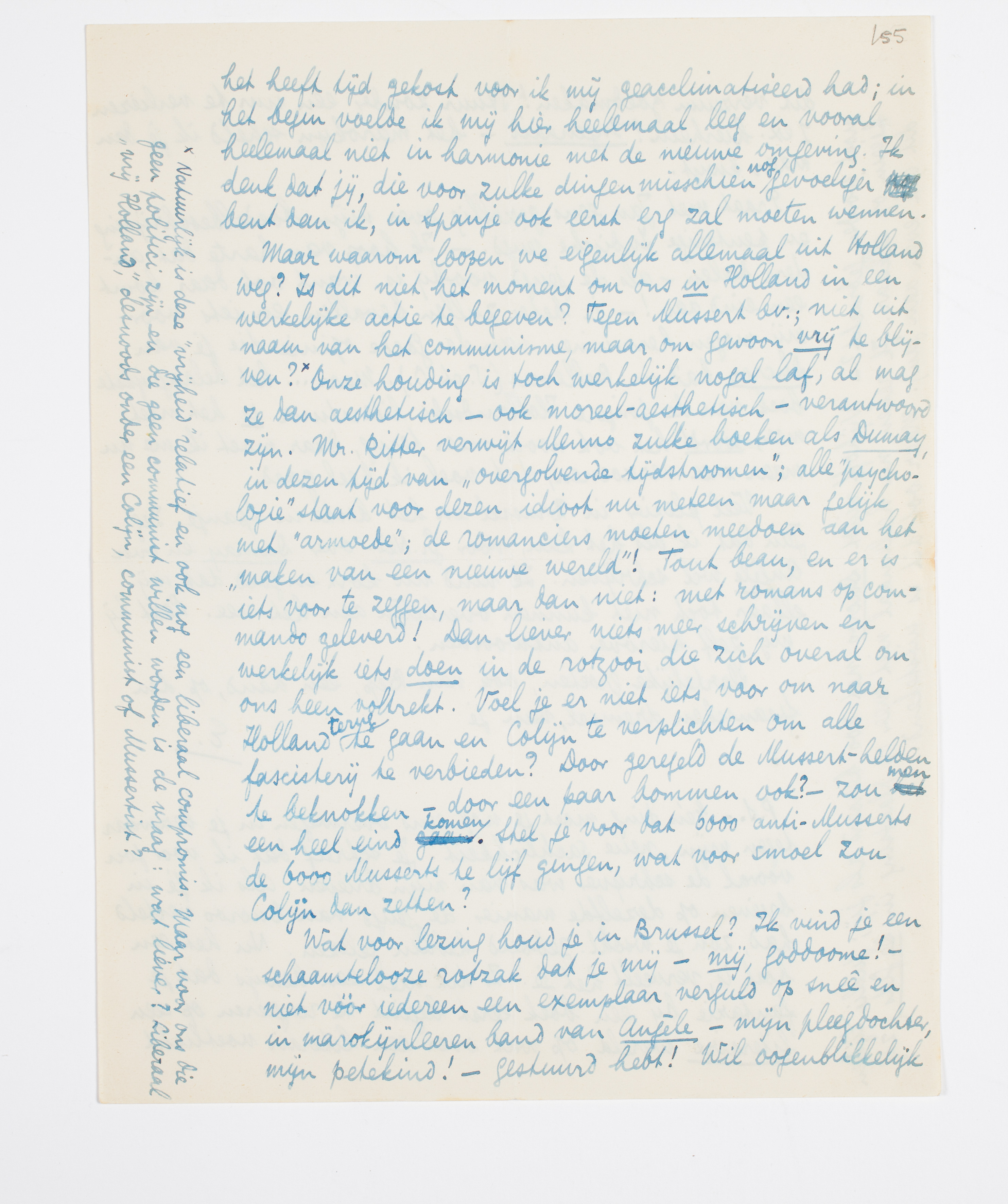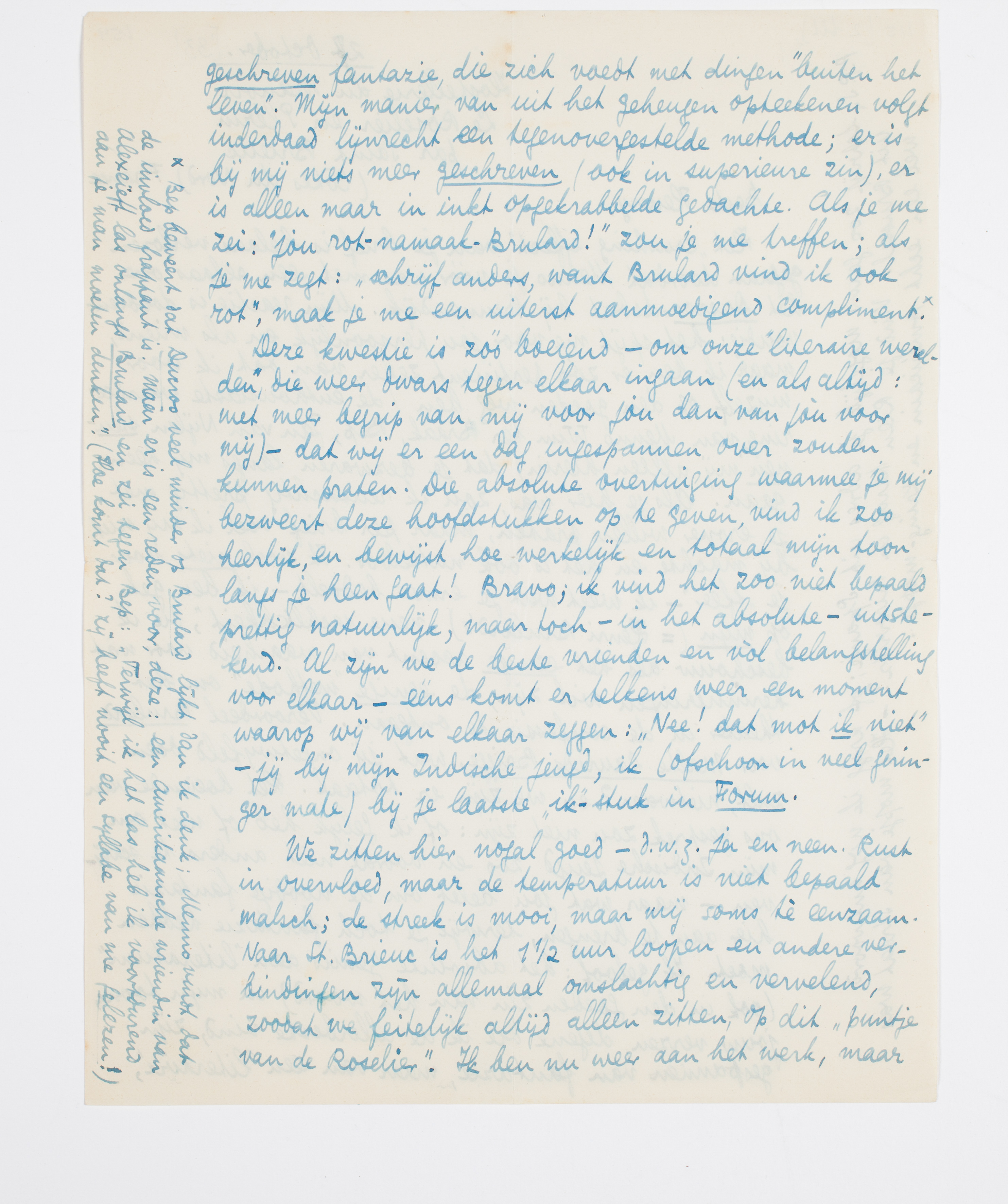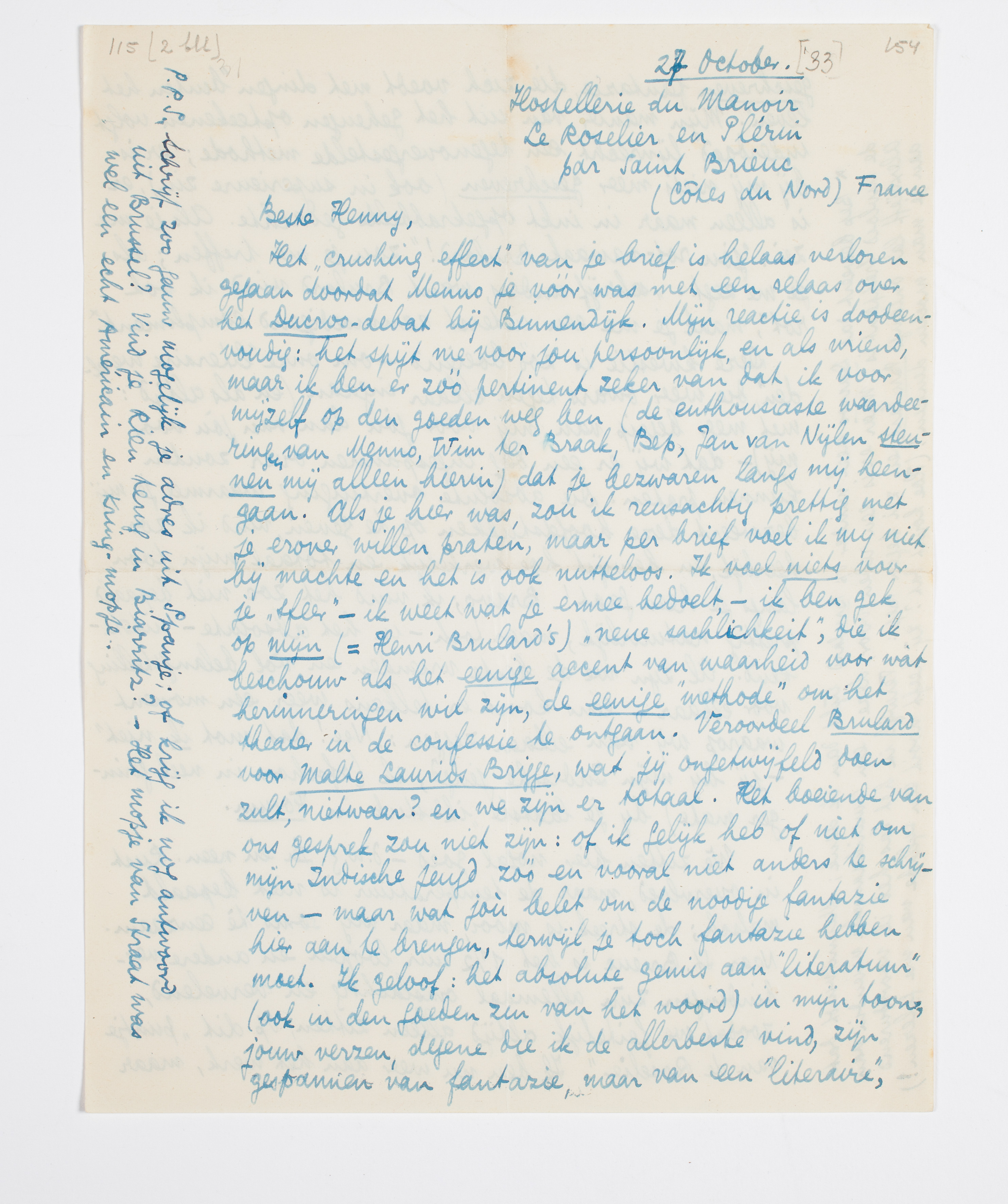 het spijt me voor jou persoonlijk, en als vriend, maar ik ben er zóó pertinent zeker van dat ik voor mijzelf op den goeden weg ben (de enthousiaste waardeeringen van Menno, Wim ter Braak, Bep, Jan van Nijlen steunen mij alleen hierin) dat je bezwaren langs mij heengaan. Als je hier was, zou ik reusachtig prettig met je erover willen praten, maar per brief voel ik mij niet bij machte en het is ook nutteloos. Ik voel niets voor je ‘sfeer’ - ik weet wat je ermee bedoelt, - ik ben gek op mijn (= Henri Brulard's) ‘neue sachlichkeit’, die ik beschouw als het eenige accent van waarheid voor wat herinneringen wil zijn, de eenige ‘methode’ om het theater in de confessie te ontgaan. Veroordeel Brulard voor Malte Laurids Brigge, wat jij ongetwijfeld doen zult, nietwaar? en we zijn er totaal. Het boeiende van ons gesprek zou niet zijn: of ik gelijk heb of niet om mijn Indische jeugd zóó en vooral niet anders te schrijven - maar wat joù belet om de noodige fantazie hier aan te brengen, terwijl je toch fantazie hebben moet. Ik geloof: het absolute gemis aan ‘literatuur’ (ook in den goeden zin van het woord) in mijn toon; jouw verzen, degene die ik de allerbeste vind, zijn gespannen van fantazie, maar van een ‘literaire’, geschreven fantazie, die zich voedt met dingen ‘buiten het leven’. Mijn manier van uit het geheugen opteekenen volgt inderdaad lijnrecht een tegenovergestelde methode; er is bij mij niets meer geschreven (ook in superieure zin), er is alleen maar in inkt opgekrabbelde gedachte. Als je me zei: ‘jou rot-namaak-Brulard!’ zou je me treffen; als je me zegt: ‘schrijf anders, want Brulard vind ik ook rot’, maak je me een uiterst aanmoedigend compliment.*