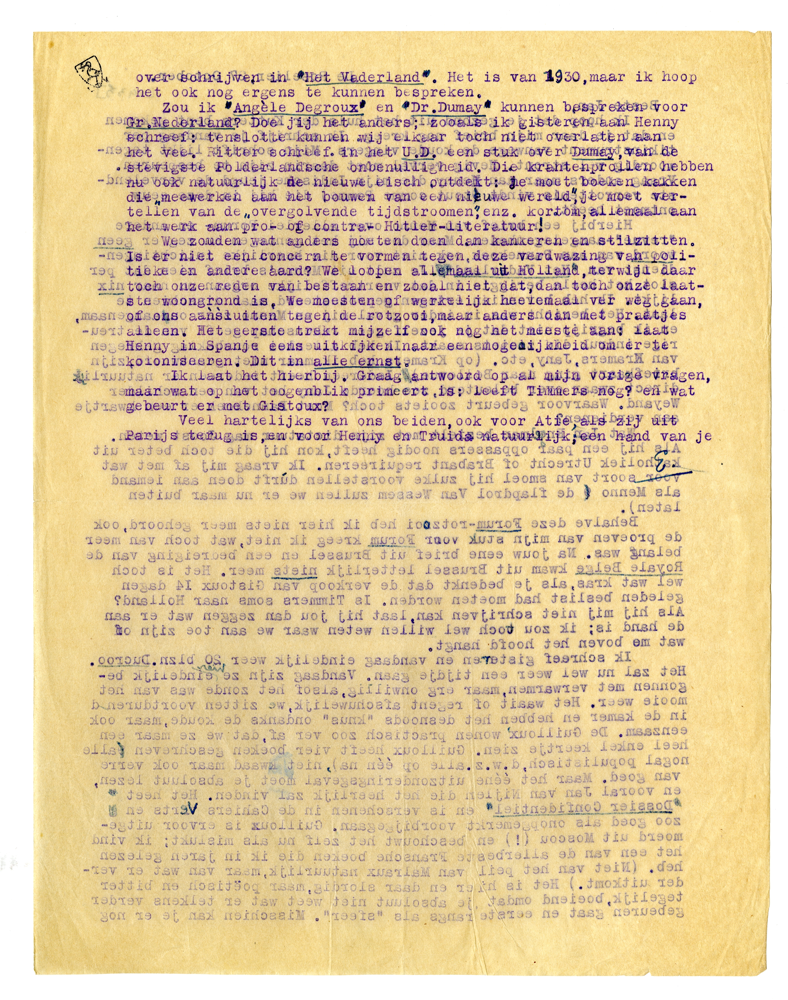 Zou ik Angèle Degroux en Dr. Dumay kunnen bespreken voor Gr. Nederland? Doe jij het anders; zooals ik gisteren aan Henny schreef: tenslotte kunnen wij elkaar toch niet overlaten aan het vee. Ritter schreef in het U.D. een stuk over Dumay, van de stevigste Polderlandsche onbenulligheid. Die krantenprollen hebben nu ook natuurlijk de nieuwe eisch ontdekt: je moet boeken kakken die ‘meewerken aan het bouwen van een nieuwe wereld’, je moet vertellen van de ‘overgolvende tijdstroomen’, enz. kortom, allemaal aan het werk aan pro- of contra-Hitler-literatuur!