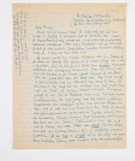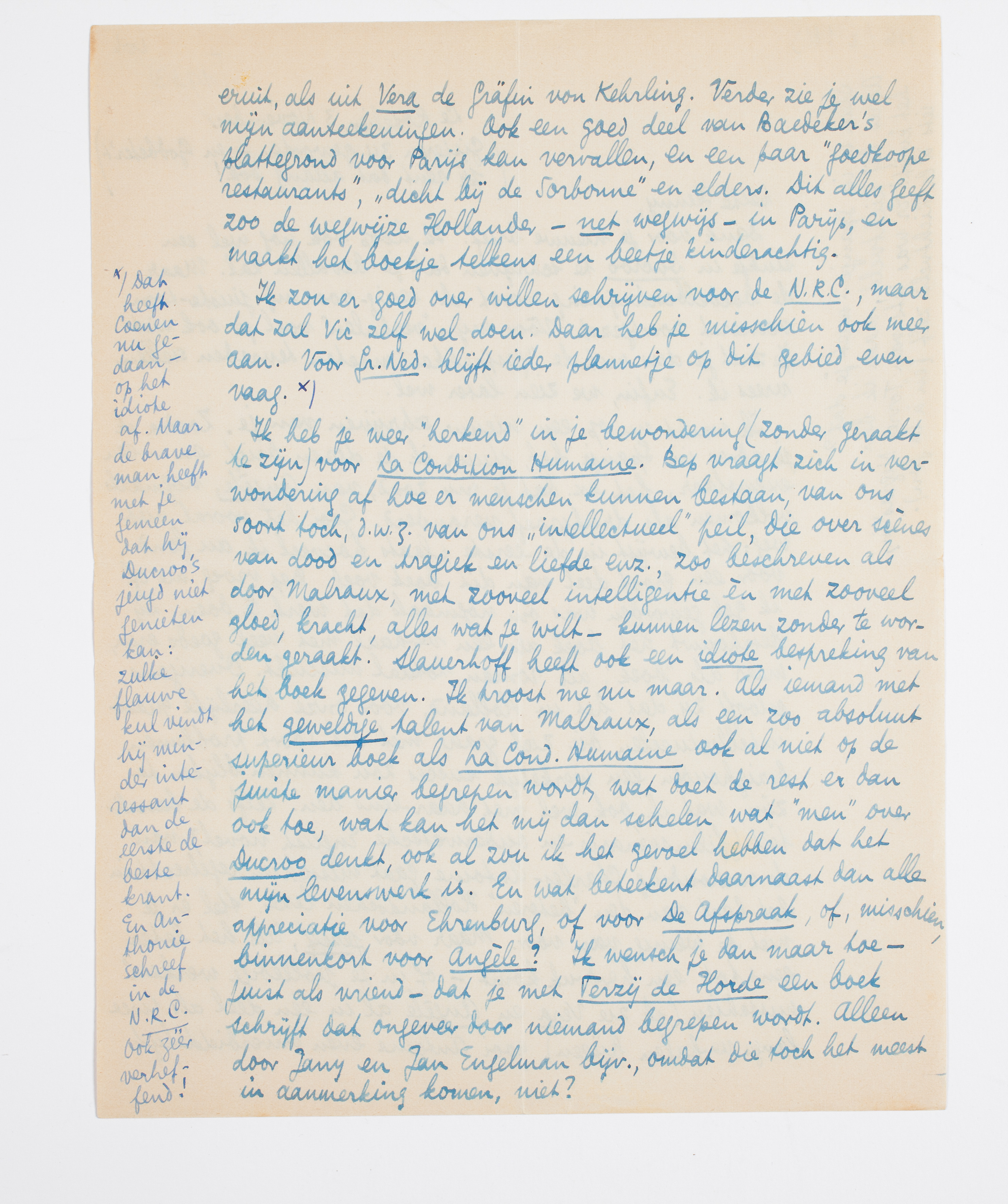 Ik heb je weer ‘herkend’ in je bewondering (zonder geraakt te zijn) voor La Condition Humaine. Bep vraagt zich in verwondering af hoe er menschen kunnen bestaan, van ons soort toch, d.w.z. van ons ‘intellectueel’ peil, die over scènes van dood en tragiek en liefde enz., zoo beschreven als door Malraux, met zooveel intelligentie èn met zooveel gloed, kracht, alles wat je wilt - kunnen lezen zonder te worden geraakt. Slauerhoff heeft ook een idiote bespreking van het boek gegeven. Ik troost me nu maar. Als iemand met het geweldige talent van Malraux, als een zoo absoluut superieur boek als La Cond. Humaine ook al niet op de juiste manier begrepen wordt, wat doet de rest er dan ook toe, wat kan het mij dan schelen wat ‘men’ over Ducroo denkt, ook al zou ik het gevoel hebben dat het mijn levenswerk is. En wat beteekent daarnaast dan alle appreciatie voor Ehrenburg, of voor De Afspraak, of, misschien binnenkort Angèle? Ik wensch je dan maar toe - juist als vriend - dat je met Terzij de Horde een boek schrijft dat ongeveer door niemand begrepen wordt. Alleen door Jany en Jan Engelman bijv., omdat die toch het meest in aanmerking komen, niet?