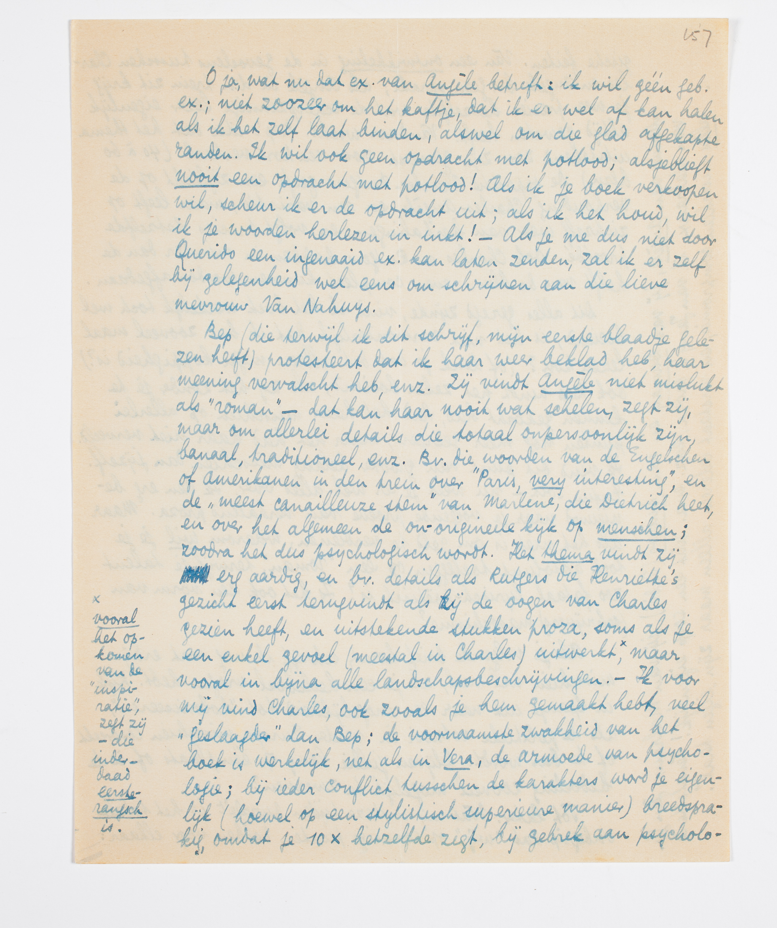 Bep (die terwijl ik dit schrijf, mijn eerste blaadje gelezen heeft) protesteert dat ik haar weer beklad heb, haar meening vervalscht heb, enz. Zij vindt Angèle niet mislukt als ‘roman’ - dat kan haar nooit wat schelen, zegt zij, maar om allerlei details die totaal onpersoonlijk zijn, banaal, traditioneel, enz. Bv. die woorden van de Engelschen of Amerikanen in den trein over ‘Paris, very interesting’, en de ‘meest canailleuze stem’ van Mariene, die Dietrich heet,2964 en over het algemeen de on-orgineele kijk op menschen; zoodra het dus psychologisch wordt. Het thema vindt zij erg aardig, en bv. details als Rutgers die Henriette's gezicht eerst terugvindt als hij de oogen van Charles gezien heeft, en uitstekende stukken proza, soms als je een enkel gevoel (meestal in Charles) uitwerkt,* maar vooral in bijna alle landschapsbeschrijvingen. - Ik voor mij vind Charles, ook zooals je hem gemaakt hebt, veel ‘geslaagder’ dan Bep; de voornaamste zwakheid van het boek is werkelijk, net als in Vera, de armoede van psychologie; bij ieder conflict tusschen de karakters word je eigenlijk (hoewel op een stylistisch superieure manier) breedsprakig, omdat je 10 × hetzelfde zegt, bij gebrek aan psychologische feiten. Van een ontwikkeling in de gevoelens tusschen Charles en Angèle bv. geen sprake; als Angèle in den trein zit krijg je weer precies hetzelfde wat de scherpzinnige lezer eigenlijk altijd geweten heeft. Vandaar wschl. Bep's idee dat het thema uitstekend zou zijn geweest voor een kort verhaal (40 à 60 blzn.) De oppositie Charles-Rutgers geeft een zijlicht op de verhouding Charles-Angèle en een variatie, maar leeft op zichzelf weer van herhalingen, en volgt precies hetzelfde procédé. Ook Charles en Rutgers hadden in minder dan de helft van de blzn. even compleet kunnen worden afgedaan.2965