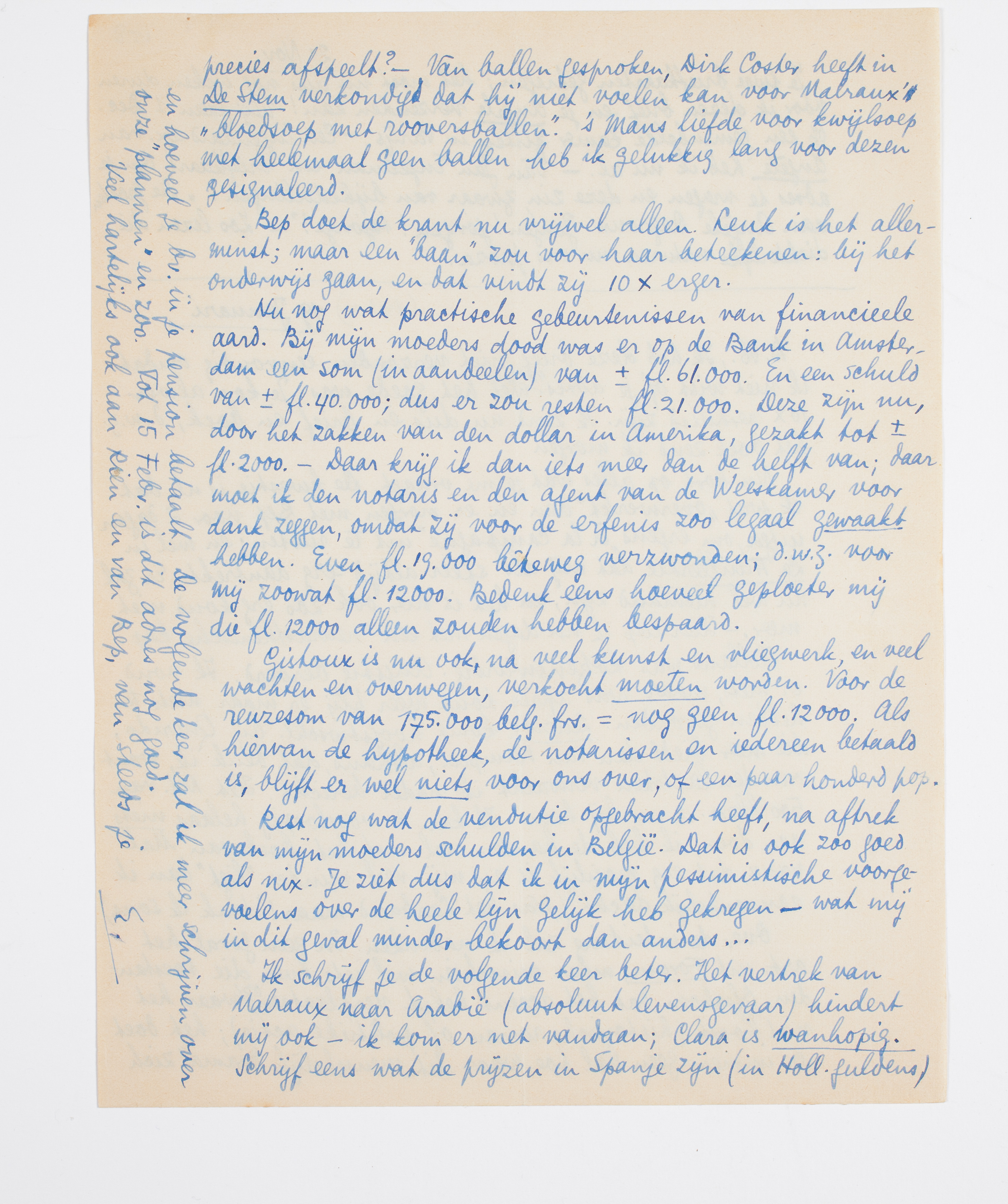 Ik schrijf je de volgende keer beter. Het vertrek van Malraux naar Arabië (absoluut levensgevaar) hindert mij ook - ik kom er net vandaan; Clara is wanhopig. Schrijf eens wat de prijzen in Spanje zijn (in Holl. guldens) en hoeveel je bv. in je pension betaalt. De volgende keer zal ik meer schrijven over onze ‘plannen’ en zoo. Tot 15 Febr. is dit adres nog goed.