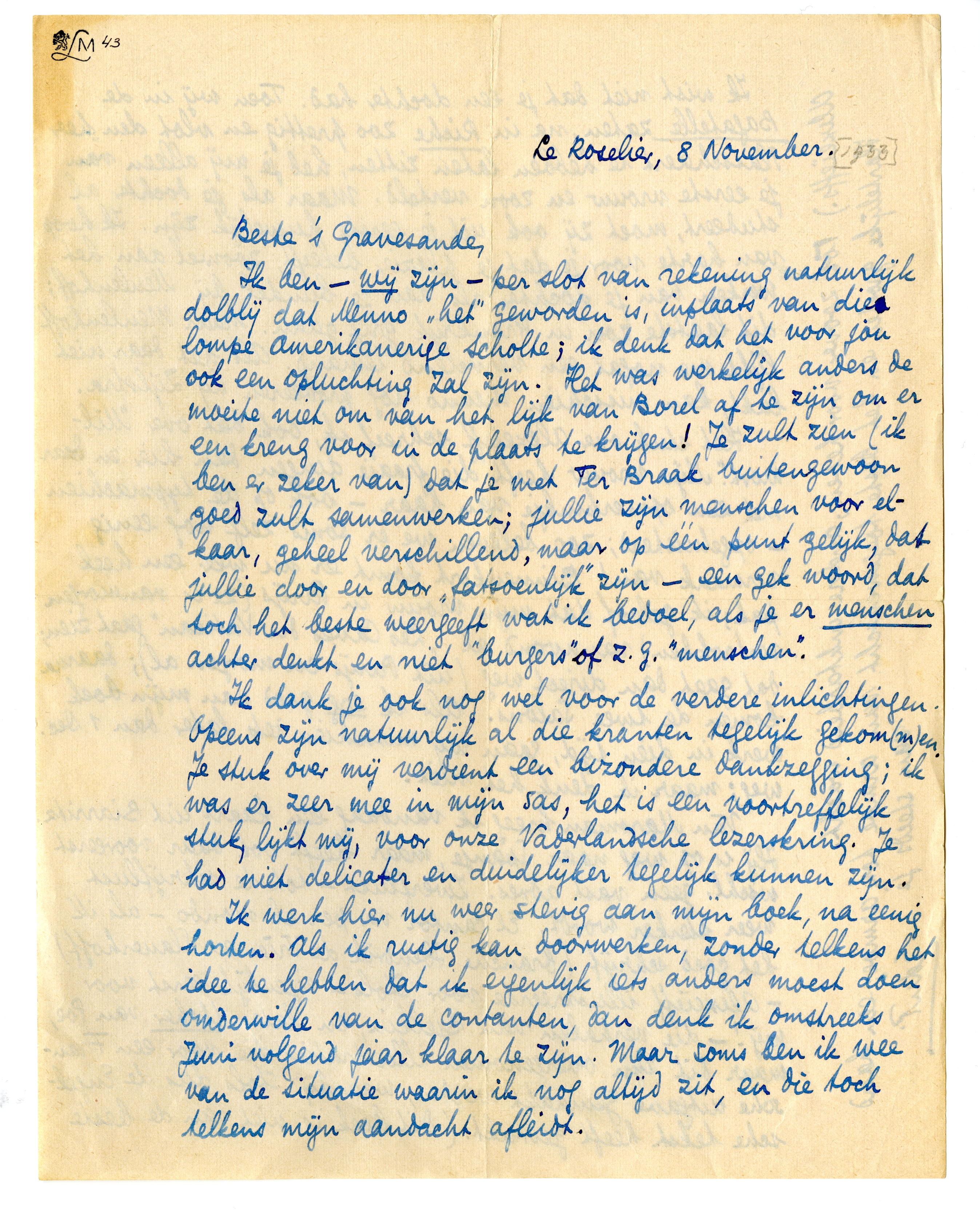 Ik ben - wij zijn - per slot van rekening natuurlijk dolblij dat Menno ‘het’ geworden is, inplaats van die lompe Amerikanerige Scholte; ik denk dat het voor jou ook een opluchting zal zijn. Het was werkelijk anders de moeite niet om van het lijk van Borel af te zijn om er een kreng voor in de plaats te krijgen! Je zult zien (ik ben er zeker van) dat je met Ter Braak buitengewoon goed zult samenwerken; jullie zijn menschen voor elkaar, geheel verschillend, maar op één punt gelijk, dat jullie door en door ‘fatsoenlijk’ zijn - een gek woord, dat toch het beste weergeeft wat ik bedoel, als je er menschen achter denkt en niet ‘burgers’ of z.g. ‘menschen’.