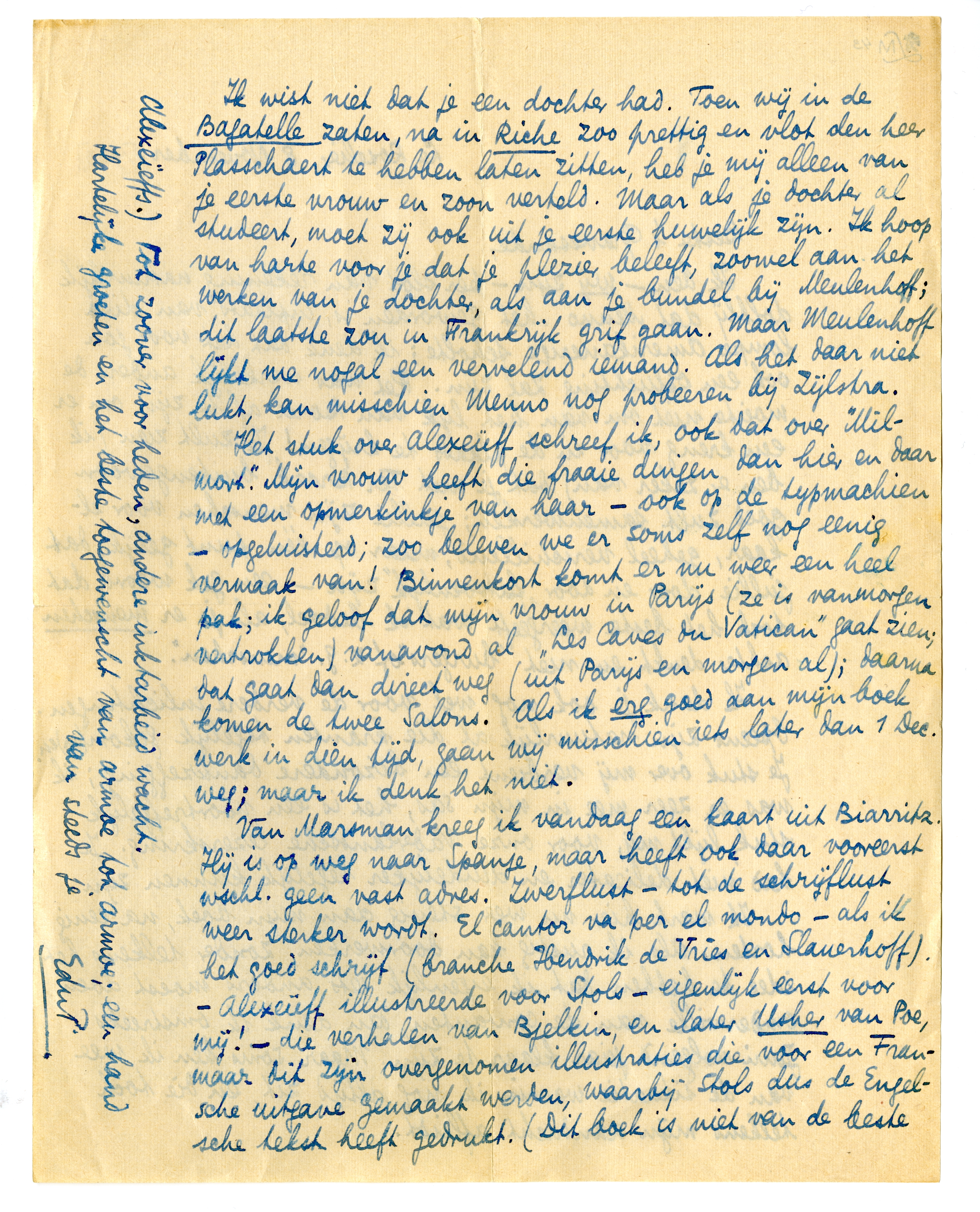 Ik wist niet dat je een dochter had. Toen wij in de Bagatelle zaten, na in Riche zoo prettig en vlot den heer Plasschaert te hebben laten zitten, heb je mij alleen van je eerste vrouw en zoon verteld. Maar als je dochter al studeert, moet zij ook uit je eerste huwelijk zijn. Ik hoop van harte voor je dat je plezier beleeft, zoowel aan het werken van je dochter, als aan je bundel bij Meulenhoff2972; dit laatste zou in Frankrijk grif gaan. Maar Meulenhoff lijkt me nogal een vervelend iemand. Als het daar niet lukt, kan misschien Menno nog probeeren bij Zijlstra.
