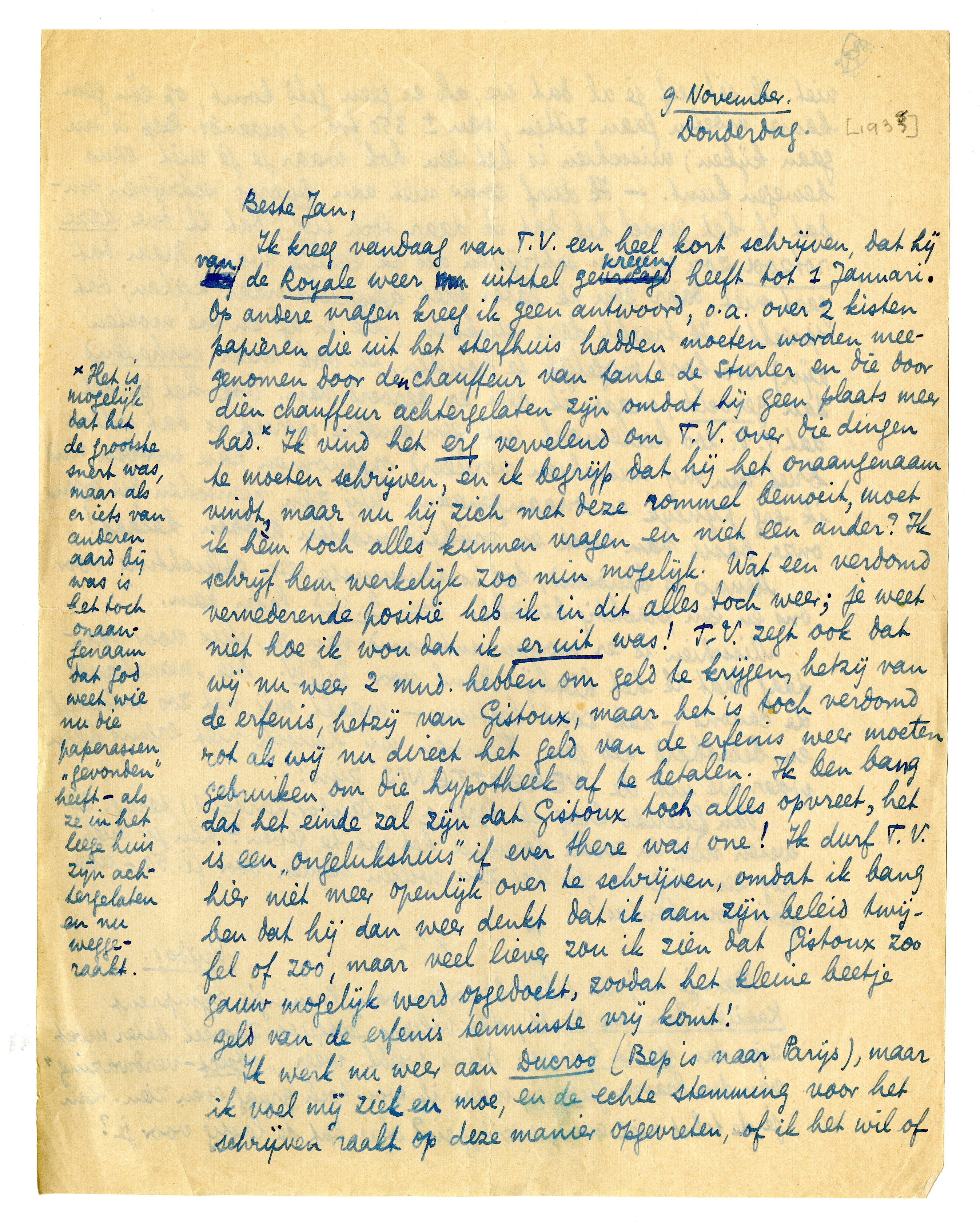 Ik kreeg vandaag van T.V. een heel kort schrijven, dat hij van de Royale weer uitstel gekregen heeft tot 1 Januari. Op andere vragen kreeg ik geen antwoord, o.a. over 2 kisten papieren die uit het sterfhuis hadden moeten worden meegenomen door den chauffeur van tante de Sturler en die door dien chauffeur achtergelaten zijn omdat hij geen plaats meer had.* Ik vind het erg vervelend om T.V. over die dingen te moeten schrijven, en ik begrijp dat hij het onaangenaam vindt, maar nu hij zich met deze rommel bemoeit, moet ik hèm toch alles kunnen vragen en niet een ander? Ik schrijf hem werkelijk zoo min mogelijk. Wat een verdomd vernederende positie heb ik in dit alles toch weer; je weet niet hoe ik wou dat ik er uit was! T.V. zegt ook dat wij nu weer 2 mnd. hebben om geld te krijgen, hetzij van de erfenis, hetzij van Gistoux, maar het is toch verdomd rot als wij nu direct het geld van de erfenis weer moeten gebruiken om die hypotheek af te betalen. Ik ben bang dat het einde zal zijn dat Gistoux toch alles opvreet, het is een ‘ongelukshuis’ if ever there was one! Ik durf T.V. hier niet meer openlijk over te schrijven, omdat ik bang ben dat hij dan weer denkt dat ik aan zijn beleid twijfel of zoo, maar veel liever zou ik zien dat Gistoux zoo gauw mogelijk werd opgedoekt, zoodat het kleine beetje geld van de erfenis tenminste vrij komt!