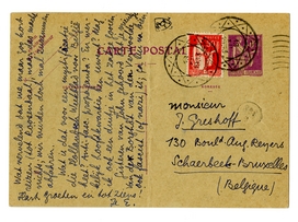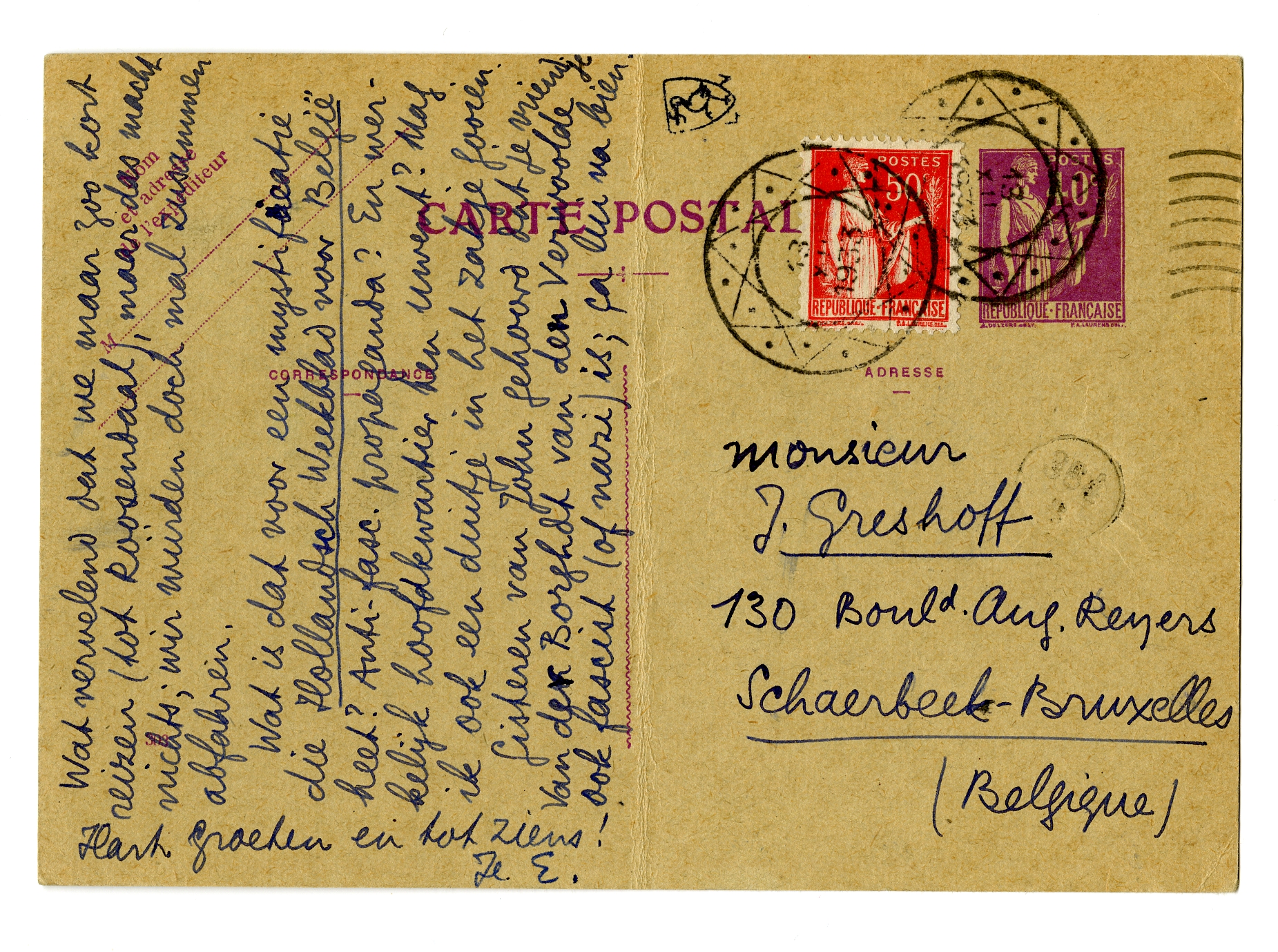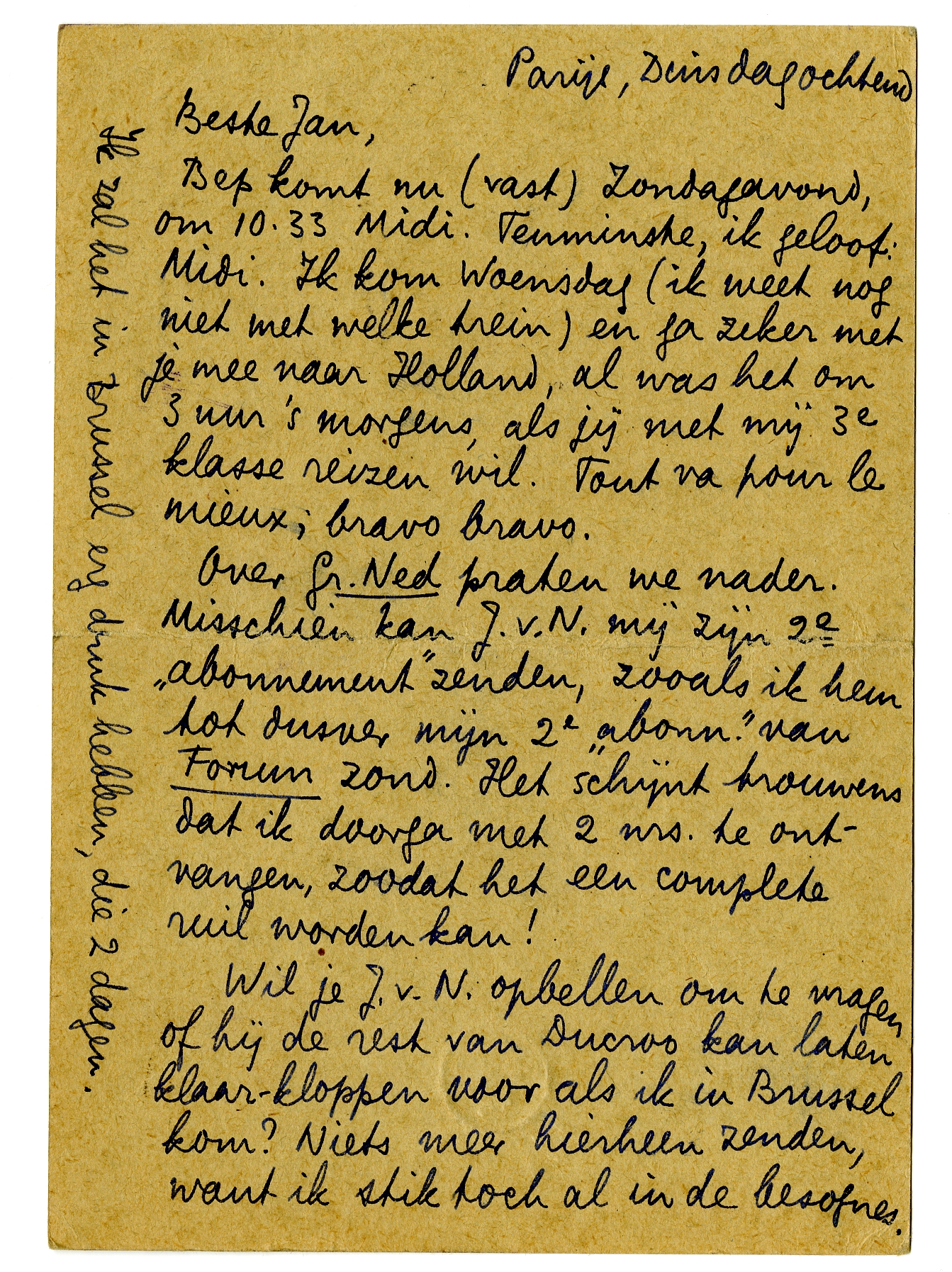 Over Gr. Ned praten we nader. Misschien kan J.v.N. mij zijn 2e ‘abonnement’ zenden, zooals ik hem tot dusver mijn 2e ‘abonn.’ van Forum zond. Het schijnt trouwens dat ik doorga met 2 nrs. te ontvangen, zoodat het een complete ruil worden kan!