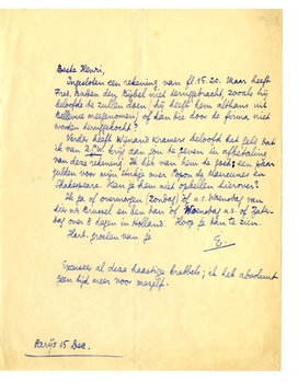 Ingesloten een rekening van fl. 15.20. Maar heeft Fred. Batten den Bijbel niet teruggebracht, zooals hij beloofde te zullen doen (hij heeft hem althans uit Bellevue meegenomen) of kan die door de firma niet worden teruggekocht?