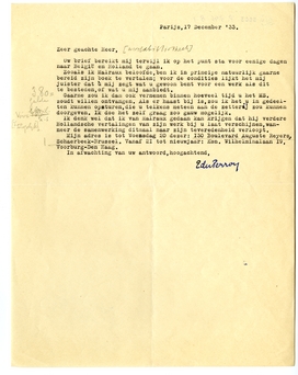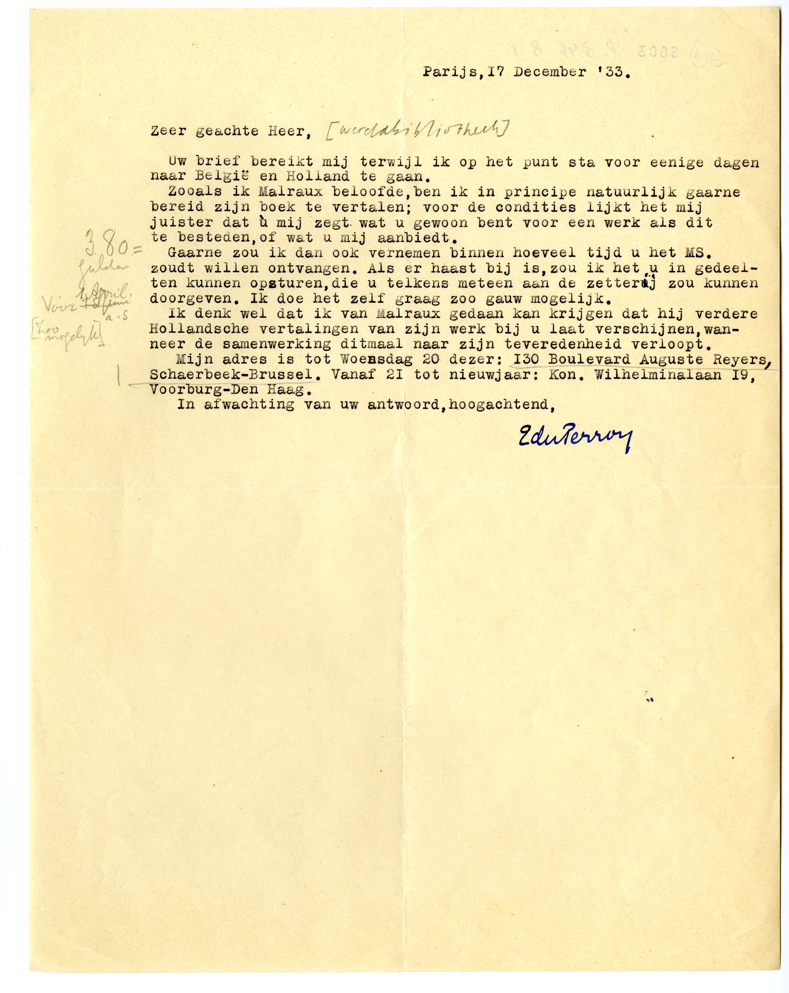 Ik denk wel dat ik van Malraux gedaan kan krijgen dat hij verdere Hollandsche vertalingen van zijn werk bij u laat verschijnen, wanneer de samenwerking ditmaal naar zijn tevredenheid verloopt.