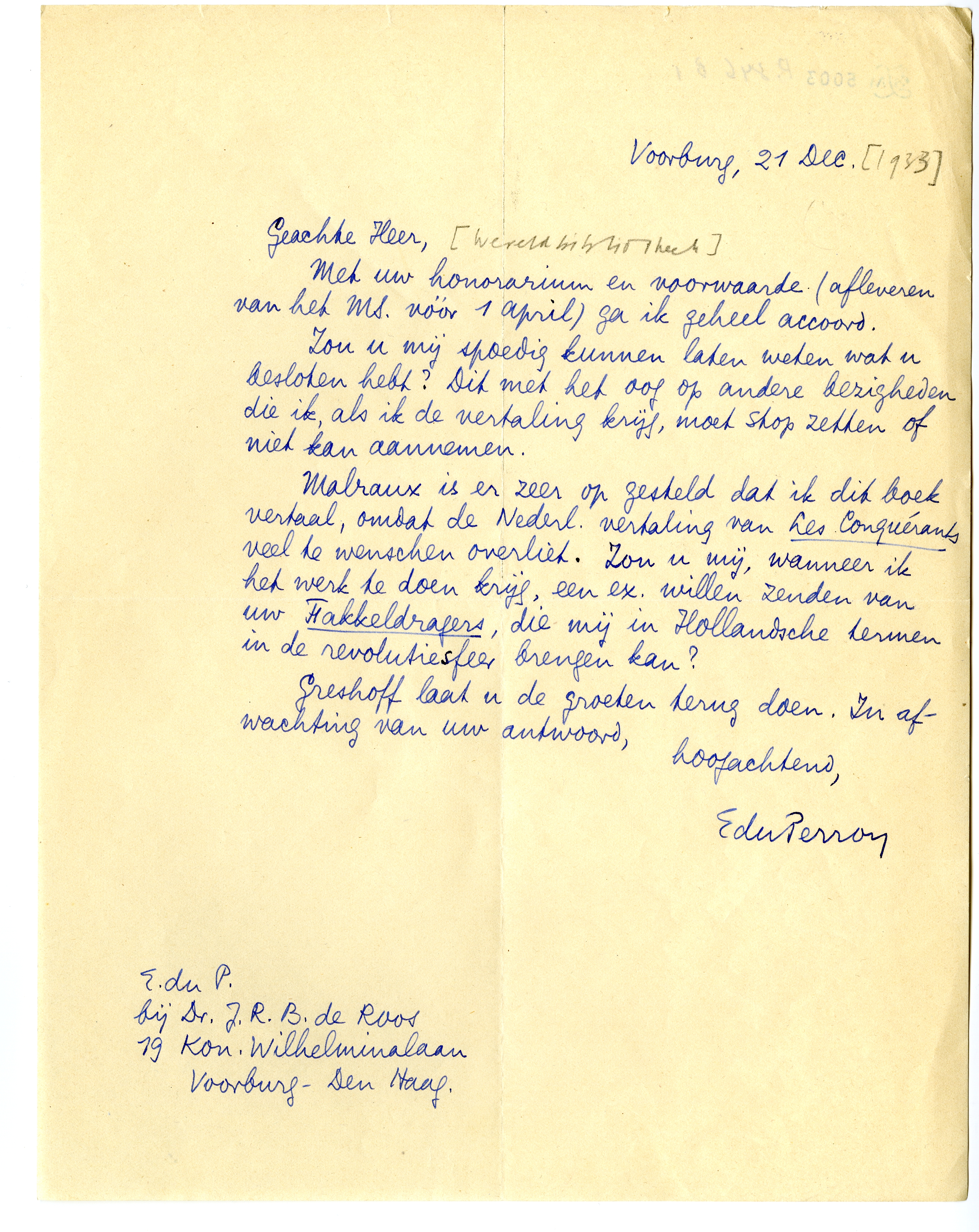 Malraux is er zeer op gesteld dat ik dit boek vertaal, omdat de Nederl. vertaling van Les Conquérants3023 veel te wenschen overliet. Zou u mij, wanneer ik het werk te doen krijg, een ex. willen zenden van uw Fakkeldragers, die mij in Hollandsche termen in de revolutiesfeer brengen kan?