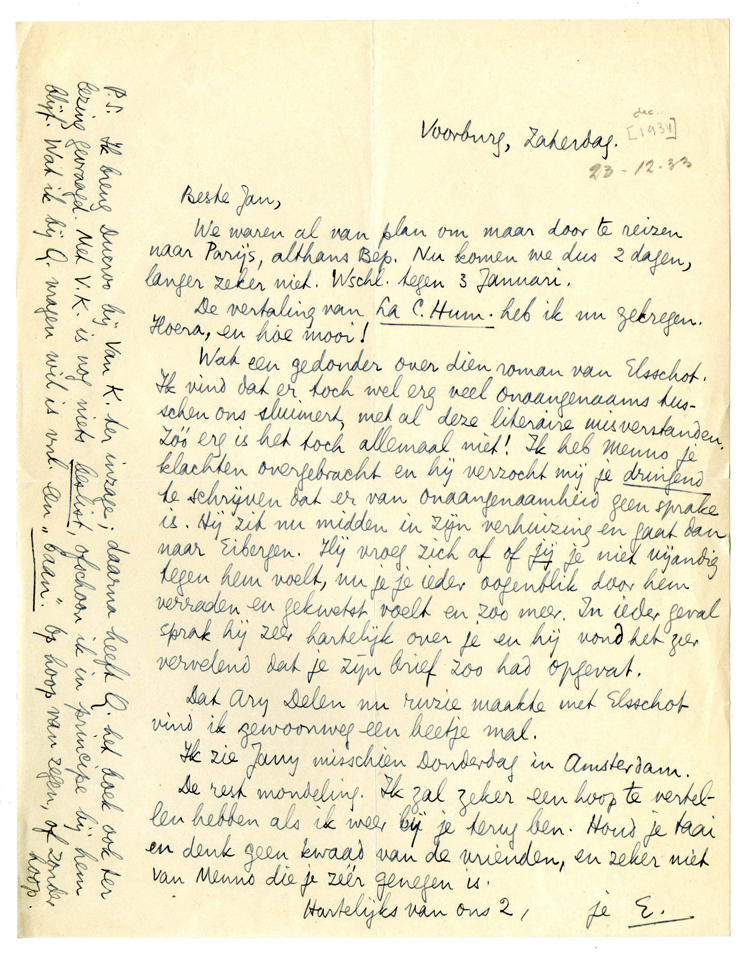 Wat een gedonder over dien roman van Elsschot3024. Ik vind dat er toch wel erg veel onaangenaams tusschen ons sluimert, met al deze literaire misverstanden. Zóó erg is het toch allemaal niet! Ik heb Menno je klachten overgebracht en hij verzocht mij je dringend te schrijven dat er van onaangenaamheid geen sprake is. Hij zit nu midden in zijn verhuizing en gaat dan naar Eibergen. Hij vroeg zich af of jij je niet vijandig tegen hem voelt, nu je je ieder oogenblik door hem verraden en gekwetst voelt en zoo meer. In ieder geval sprak hij zeer hartelijk over je en hij vond het zeer vervelend dat je zijn brief zoo had opgevat.