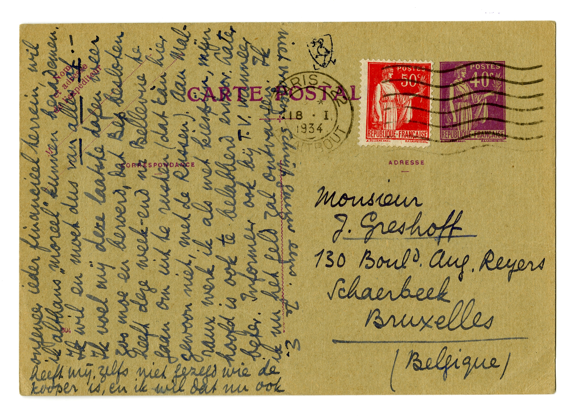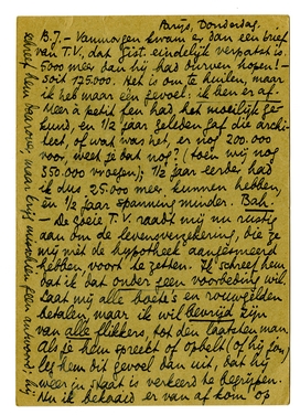 B.J. - Vanmorgen kwam er dan een brief van T.V., dat Gist. eindelijk verpatst is. 5000 meer dan hij had durven hopen! - soit 175.000. Het is om te huilen, maar ik heb maar één gevoel: ik ben er af. Meer à petit feu had het moeilijk gekund, en ½ jaar geleden gaf die architect, of wat was het, er nog 200.000 voor, weet je dat nog? (toen wij nog 350.000 vroegen); ½ jaar eerder had ik dus 25.000 meer kunnen hebben, èn ½ jaar spanning minder. Bah. - De goeie T.V. raadt mij nu rustig aan om de levensverzekering, die ze mij mèt de hypotheek aangesmeerd hebben, voort te zetten. Ik schreef hem dat ik dat onder geen voorbeding wil. Laat mij alle boete's en rouwgelden betalen, maar ik wil bevrijd zijn van alle flikkers, tot den laatsten man. Als je hem spreekt of opbelt (of hij jou) leg hem dit gevoel dan uit, dat hij weer in staat is verkeerd te begrijpen. Nu ik bekaaid er van af kom op ongeveer ieder financieel terrein, wil ik althans ‘moreel’ kunnen herademen. Ik wil en moet dus van alles af. - Ik voel mij deze laatste dagen weer zoo moe en beroerd, dat Bep besloten heeft deze week-end nr Bellevue te gaan om uit te rusten (dat kàn hier gewoon niet, met de Russen). Aan Malraux werk ik als met kiespijn, mijn hoofd is ook te belabberd ervoor. Later beter. Informeer ook bij T.V. wanneer ik nu het geld zal ontvangen. Ik schreef hem daarover, maar krijg misschien geen antwoord; hij heeft mij zelfs niet gezegd wie de kooper is, en ik wil dat nu ook niet vragen. Schrijf gauw eens.