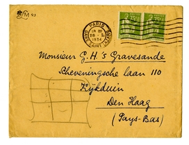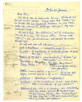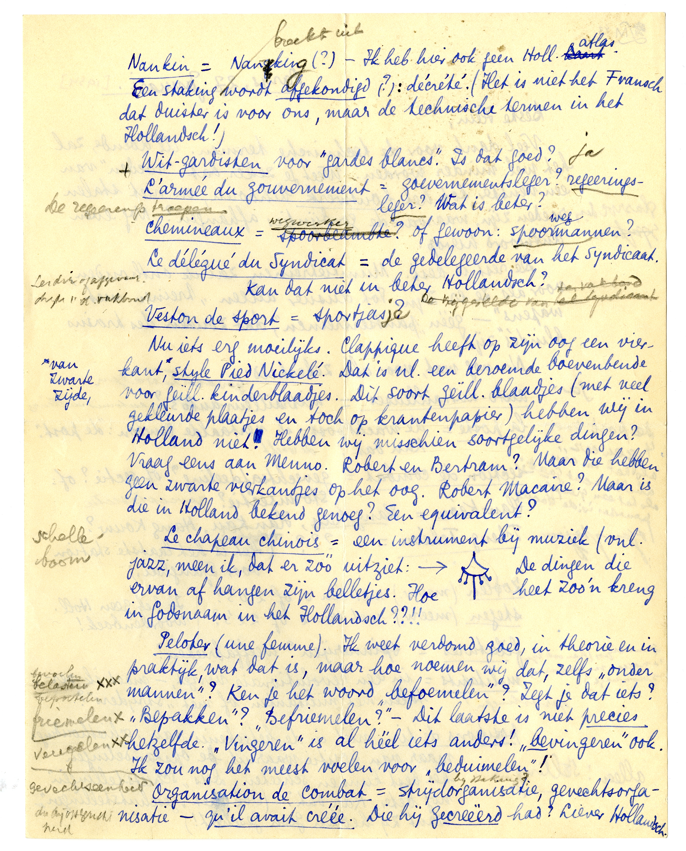 | Nu iets erg moeilijks. Clappique heeft op zijn oog een vierkant,* style Pied Nickelé. Dat is nl. een beroemde boevenbende voor geïll. kinderblaadjes. Dit soort geïll. blaadjes (met veel gekleurde plaatjes en toch op krantenpapier) hebben wij in Holland niet. Hebben wij misschien soortgelijke dingen? Vraag eens aan Menno. Robert en Bertram? Maar die hebben geen zwarte vierkantjes op het oog. Robert Macaire? Maar is die in Holland bekend genoeg? Een equivalent? | |