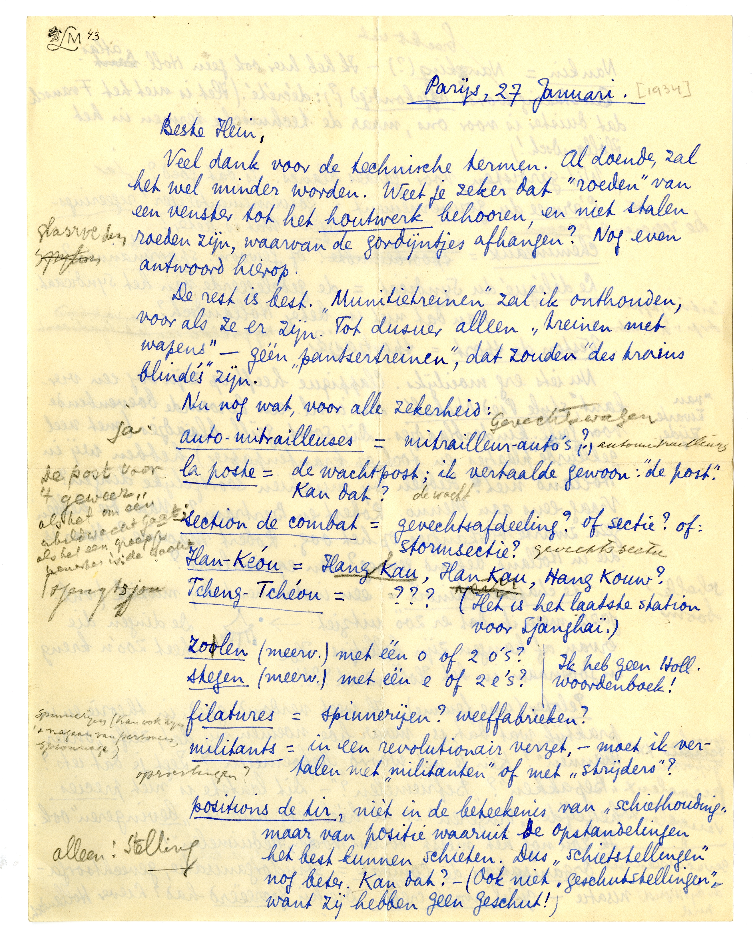 | positions de tir, niet in de beteekenis van ‘schiethouding’ maar van positie waaruit de opstandelingen het best kunnen schieten. Dus ‘schietstellingen’ nog beter. Kan dat? - (Ook niet ‘geschutstellingen’, want zij hebben geen geschut!) | |