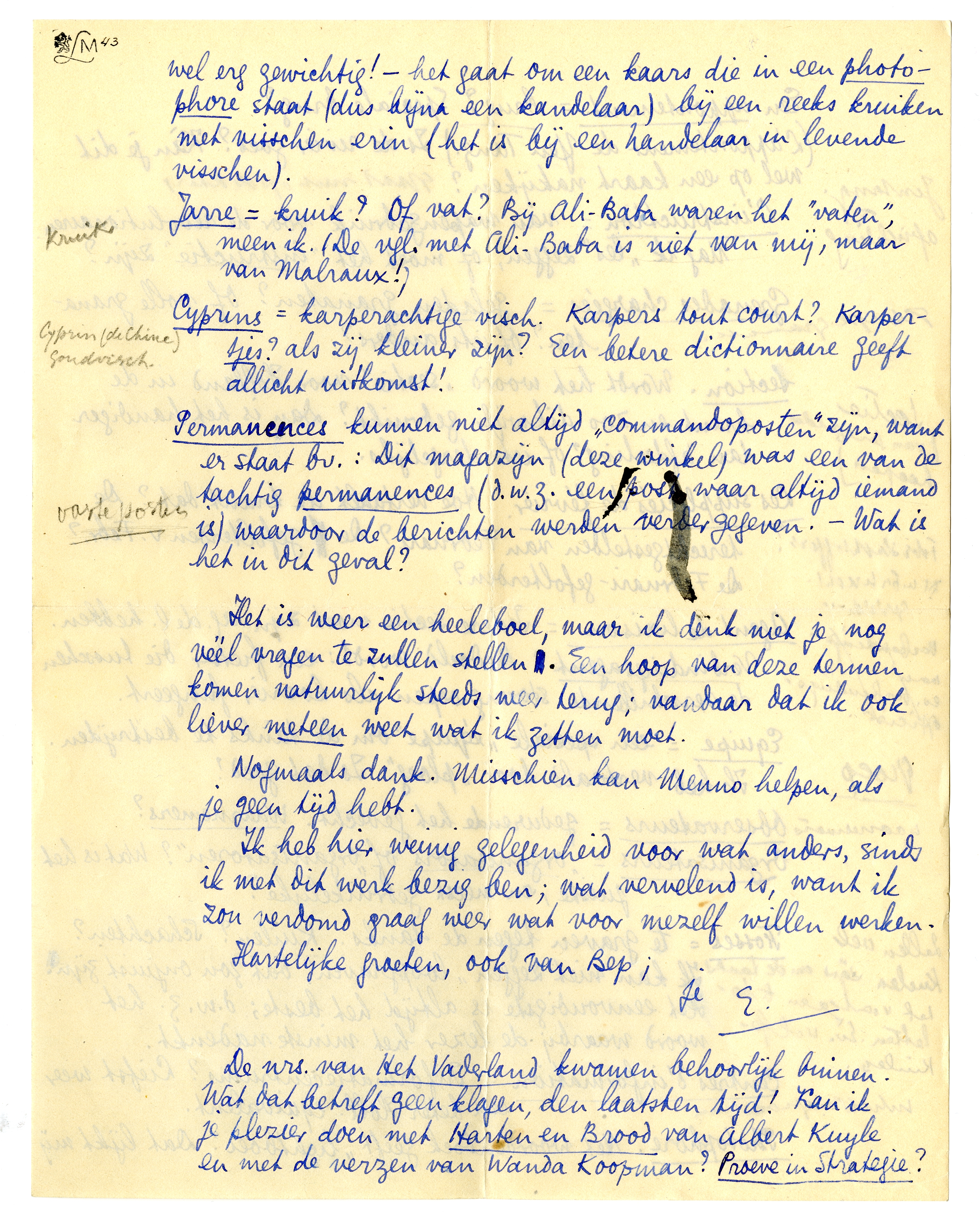 De nrs. van Het Vaderland kwamen behoorlijk binnen. Wat dat betreft geen klagen, den laatsten tijd! Kan ik je plezier doen met Harten en Brood van Albert Kuyle en met de verzen van Wanda Koopman? Proeve in Strategie?