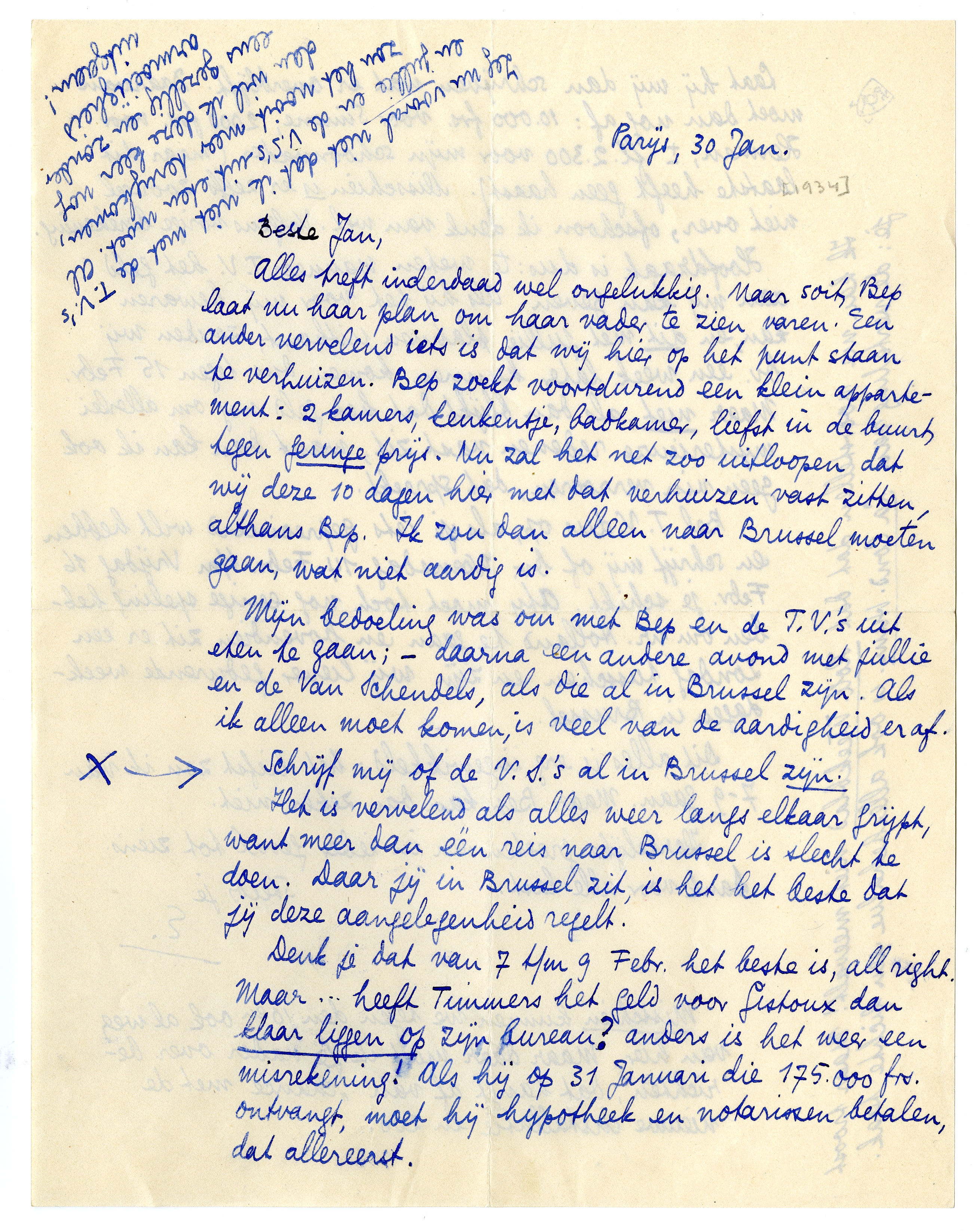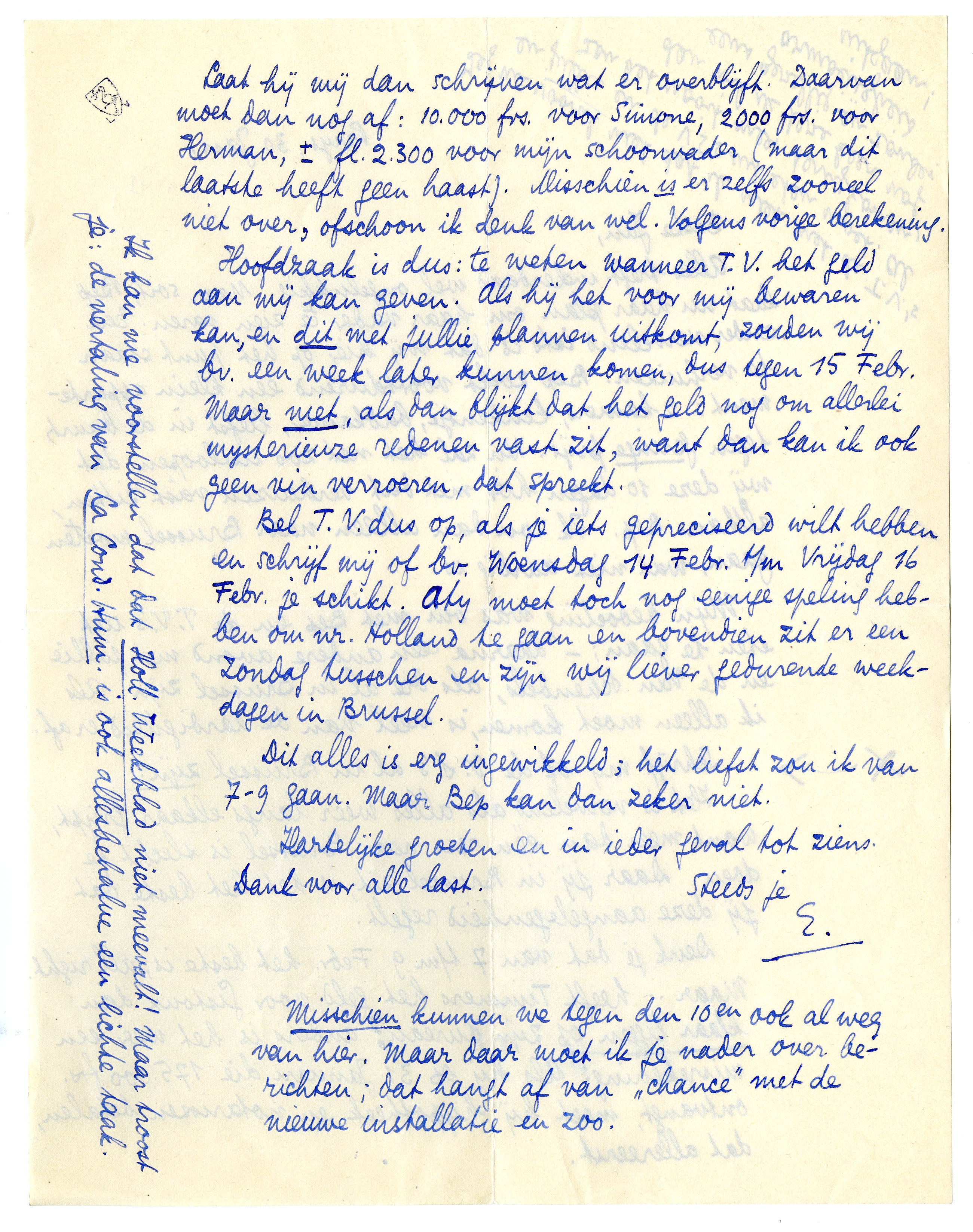 Hoofdzaak is dus: te weten wanneer T.V. het geld aan mij kan geven. Als hij het voor mij bewaren kan, en dit met jullie plannen uitkomt, zouden wij bv. een week later kunnen komen, dus tegen 15 Febr. Maar niet, als dan blijkt dat het geld nog om allerlei mysterieuze redenen vast zit, want dan kan ik ook geen vin verroeren, dat spreekt.