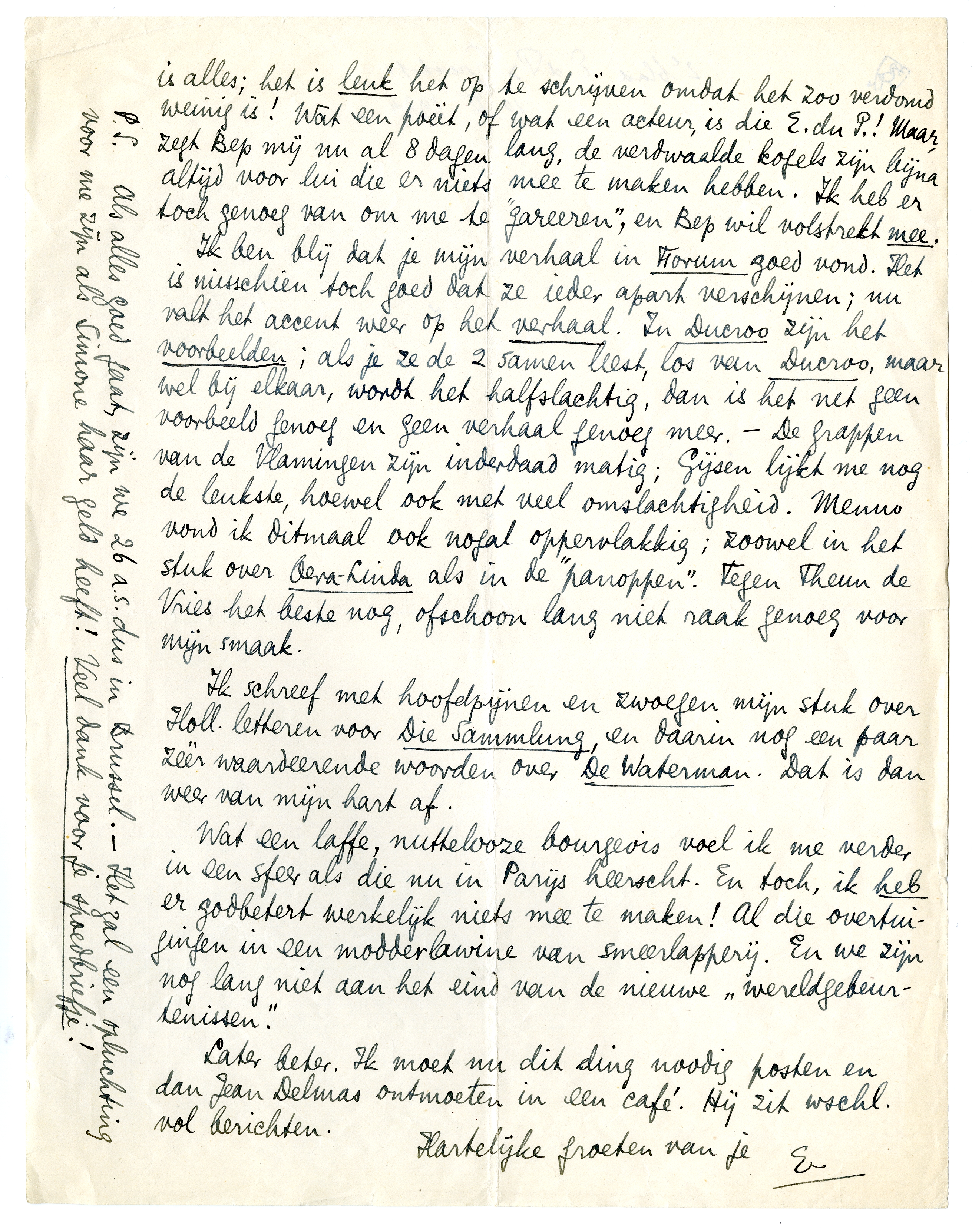 Ik schreef met hoofdpijnen en zwoegen mijn stuk over Holl. letteren voor Die Sammlung, en daarin nog een paar zèèr waardeerende woorden over De Waterman. Dat is dan weer van mijn hart af.