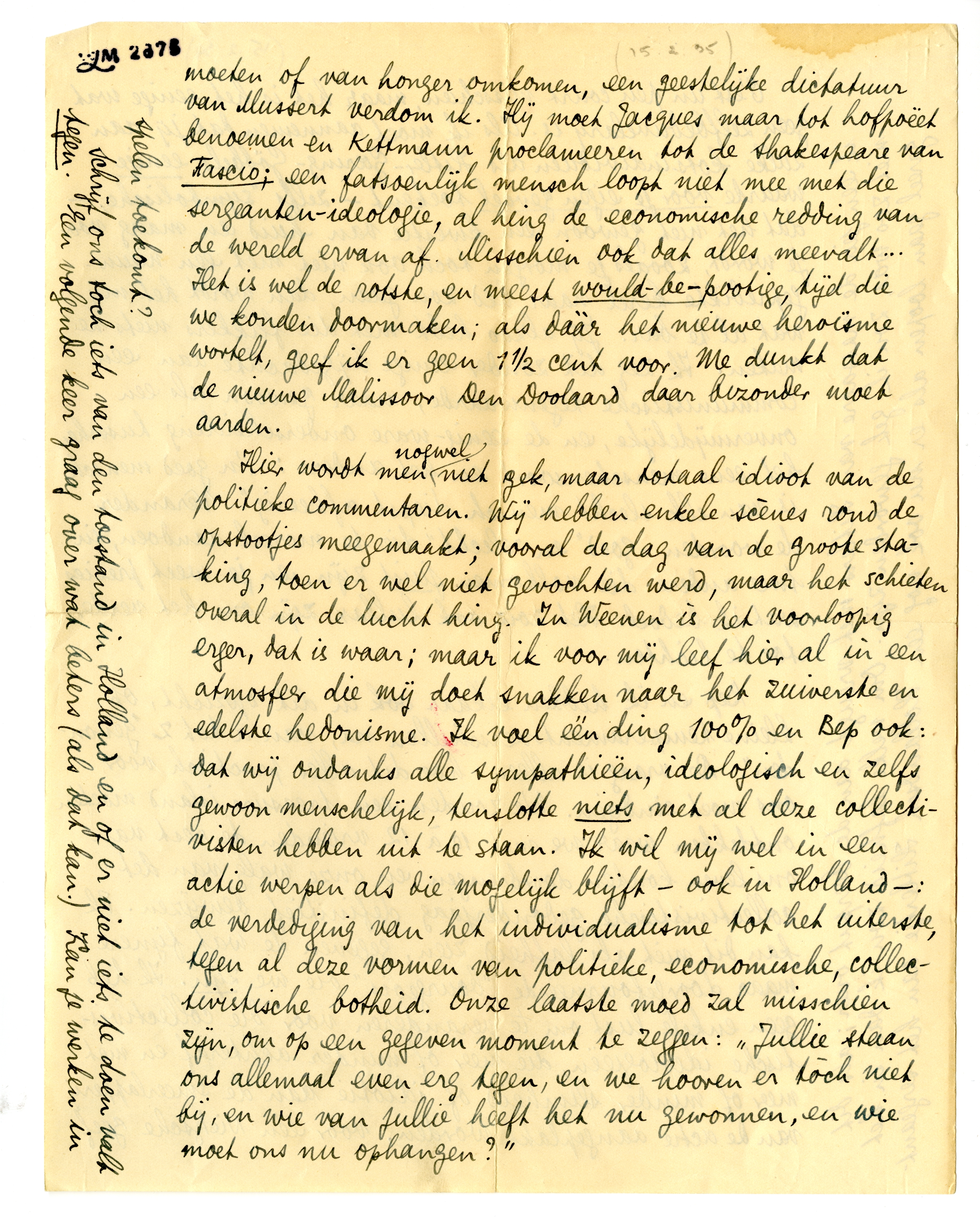 Hier wordt men nogwel niet gek, maar totaal idioot van de politieke commentaren. Wij hebben enkele scènes rond de opstootjes meegemaakt; vooral de dag van de groote staking, toen er wel niet gevochten werd, maar het schieten overal in de lucht hing. In Weenen is het voorloopig erger, dat is waar3078; maar ik voor mij leef hier al in een atmosfeer die mij doet snakken naar het zuiverste en edelste hedonisme. Ik voel één ding 100% en Bep ook: dat wij ondanks alle sympathieën, ideologisch en zelfs gewoon menschelijk, tenslotte niets met al deze collectivisten hebben uit te staan. Ik wil mij wel in een actie werpen als die mogelijk blijft - ook in Holland -: de verdediging van het individualisme tot het uiterste, tegen al deze vormen van politieke, economische, collectivistische botheid. Onze laatste moed zal misschien zijn, om op een gegeven moment te zeggen: ‘Jullie staan ons allemaal even erg tegen, en we hooren er tòch niet bij, en wie van jullie heeft het nu gewonnen, en wie moet ons nu ophangen?’