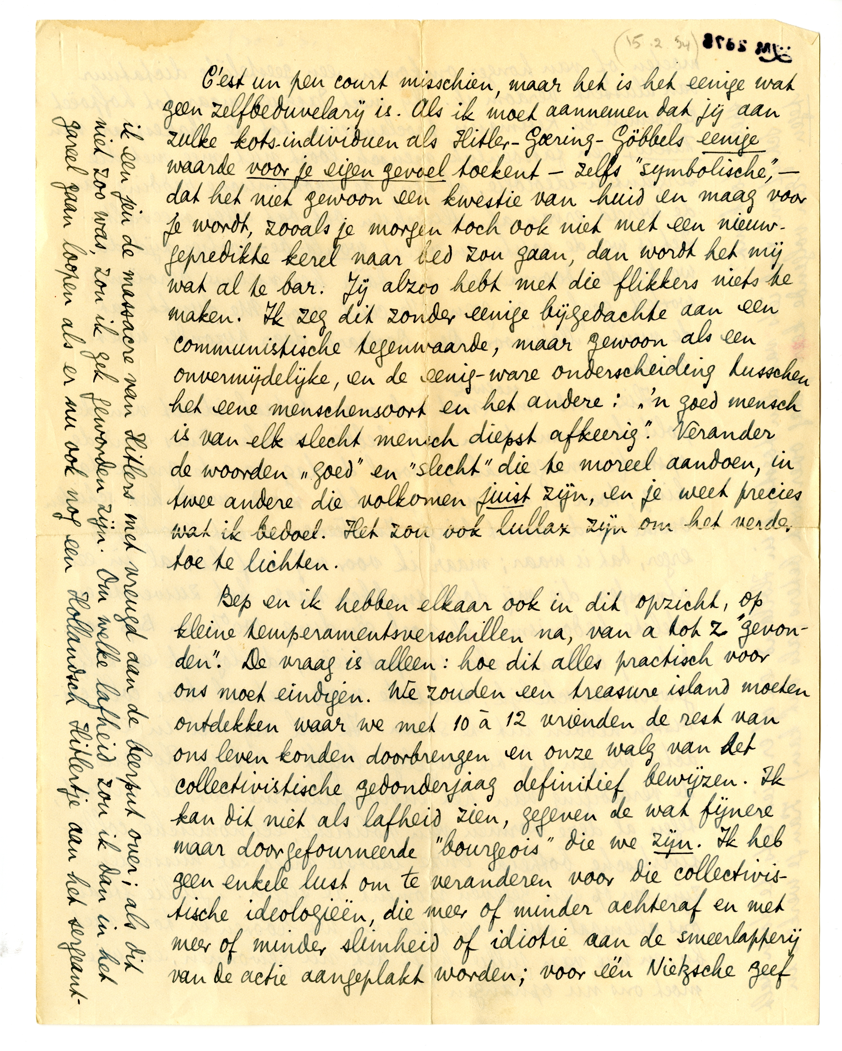 Bep en ik hebben elkaar in dit opzicht, op kleine temperamentsverschillen na, van a tot z ‘gevonden’. De vraag is alleen: hoe dit alles practisch voor ons moet eindigen. We zouden een treasure island moeten ontdekken waar we met 10 à 12 vrienden de rest van ons leven konden doorbrengen en onze walg van het collectivistische gedonderjaag definitief bewijzen. Ik kan dit niet als lafheid zien, gegeven de wat fijnere maar doorgefourneerde ‘bourgeois’ die we zijn. Ik heb geen enkele lust om te veranderen voor die collectivistische ideologieën, die meer of minder achteraf en met meer of minder slimheid of idiotie aan de smeerlapperij van de actie aangeplakt worden: voor één Nietzsche geef ik een jeu de massacre van Hitlers met vreugd aan de beerput over; als dit niet zoo was, zou ik gek geworden zijn. Om welke lafheid zou ik dan in het gareel gaan loopen als er nu ook nog een Hollandsch Hitlertje aan het sergeant-spelen toekomt?