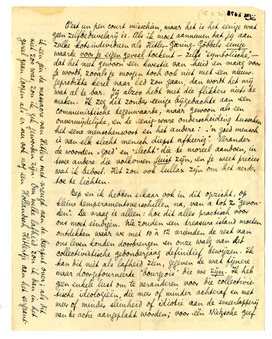 C'est un peu court misschien, maar het is het eenige wat geen zelfbeduvelarij is. Als ik moet aannemen dat jij aan zulke kots-individuen als Hitler-Goering-Göbbels eenige waarde voor je eigen gevoel toekent - zelfs ‘symbolische’, - dat het niet gewoon een kwestie van huid en maag voor je wordt, zooals je morgen toch ook niet met een nieuw-gepredikte kerel naar bed zou gaan, dan wordt het mij wat al te bar. Jij alzoo hebt met die flikkers niets te maken. Ik zeg dit zonder eenige bijgedachte aan een communistische tegenwaarde, maar gewoon als een onvermijdelijke, en de eenig-ware onderscheiding tusschen het eene menschensoort en het andere: ‘'n goed mensch is van elk slecht mensch diepst afkeerig’. Verander de woorden ‘goed’ en ‘slecht’ die te moreel aandoen, in twee andere die volkomen juist zijn, en je weet precies wat ik bedoel. Het zou ook lullax zijn om het verder toe te lichten.