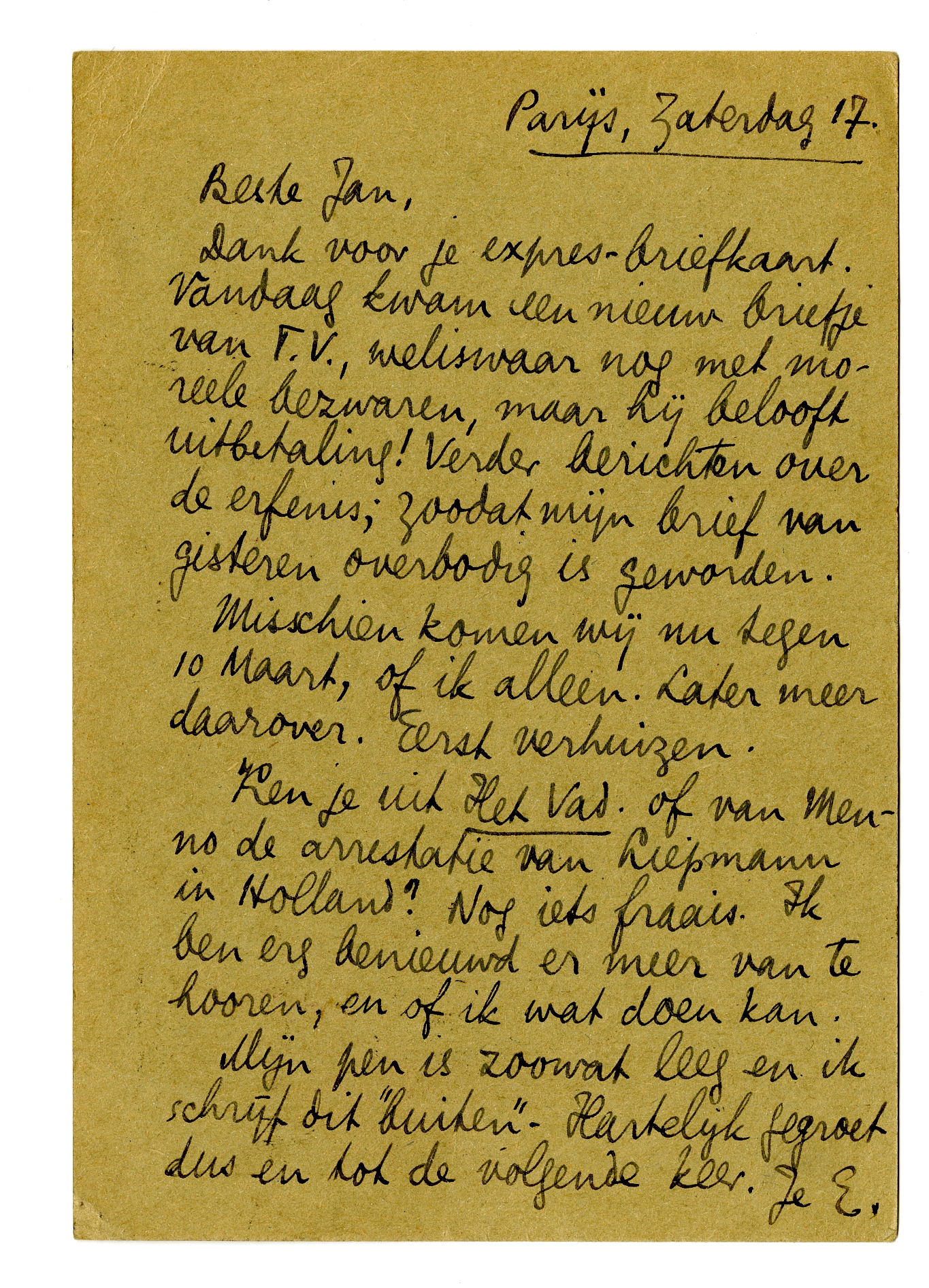 Dank voor je expres-briefkaart. Vandaag kwam een nieuw briefje van T.V., weliswaar nog met moreele bezwaren, maar hij belooft uitbetaling! Verder berichten over de erfenis; zoodat mijn brief van gisteren overbodig is geworden.