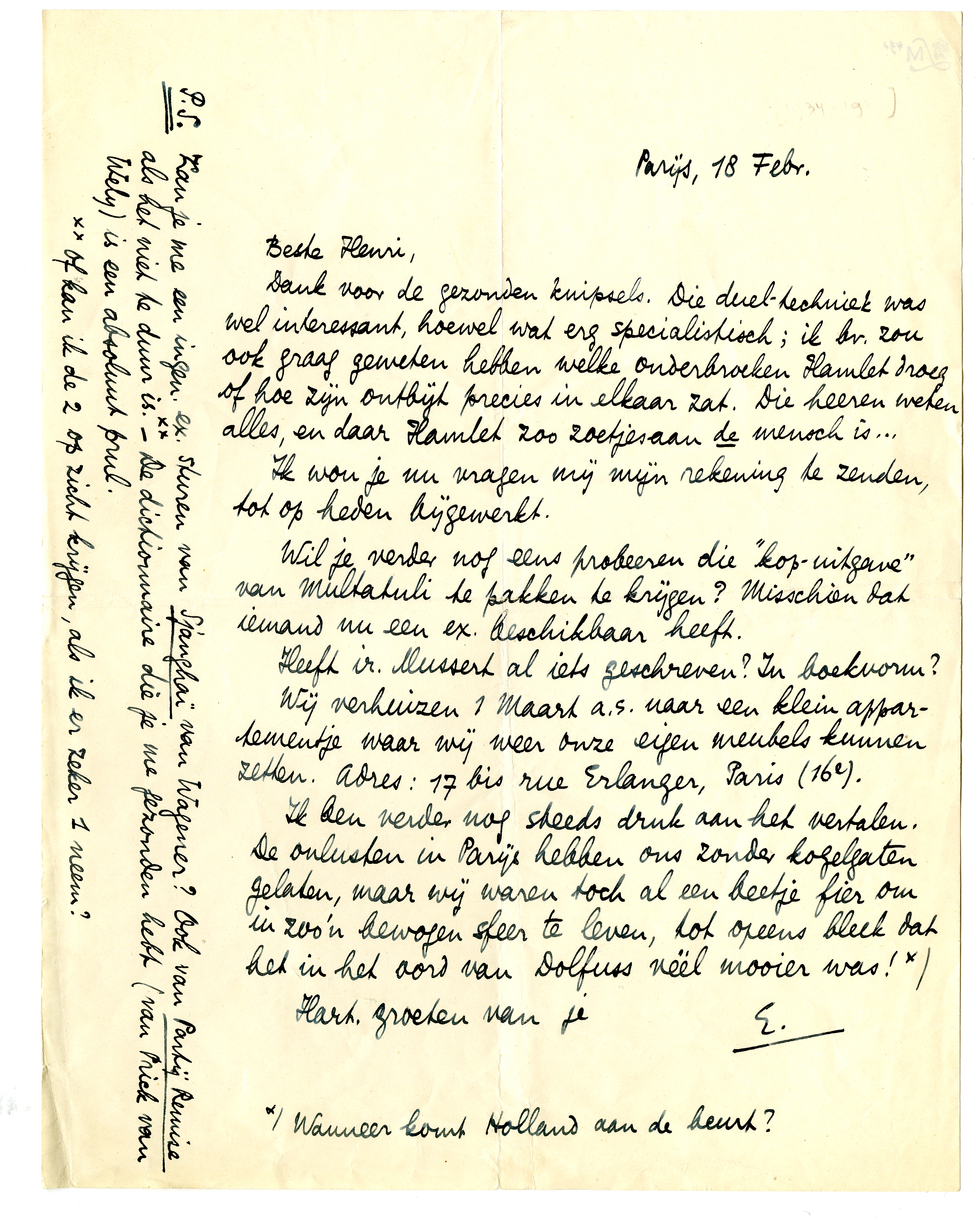 Wij verhuizen 1 Maart a.s. naar een klein appartementje waar wij weer onze eigen meubels kunnen zetten. Adres: 17 bis rue Erlanger, Paris (16e).