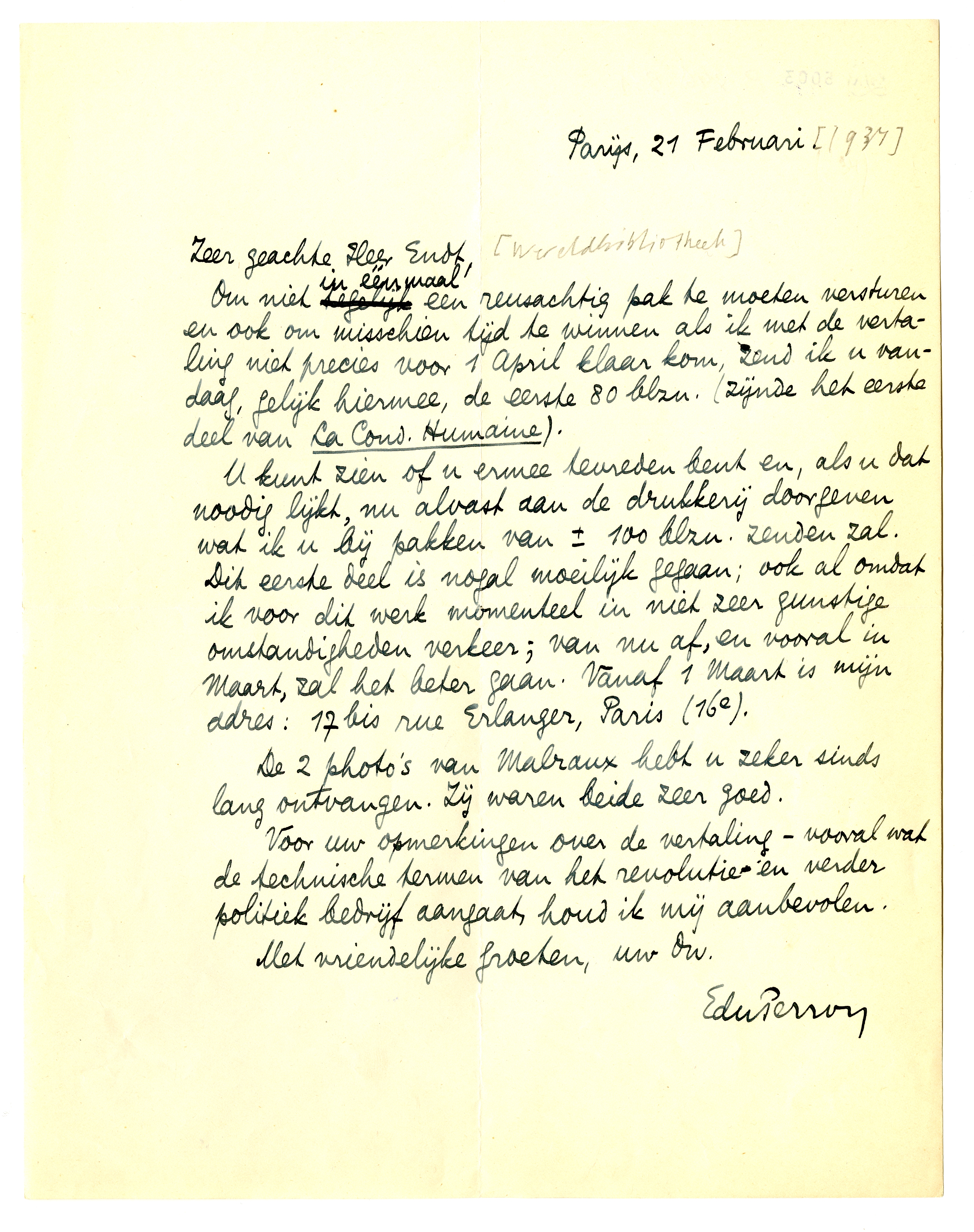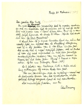 U kunt zien of u ermee tevreden bent en, als u dat noodig lijkt, nu alvast aan de drukkerij doorgeven wat ik u bij pakken van ± 100 blzn. zenden zal. Dit eerste deel is nogal moeilijk gegaan; ook al omdat ik voor dit werk momenteel in niet zeer gunstige omstandigheden verkeer; van nu af, en vooral in Maart, zal het beter gaan. Vanaf 1 Maart is mijn adres: 17 bis rue Erlanger, Paris (16e).