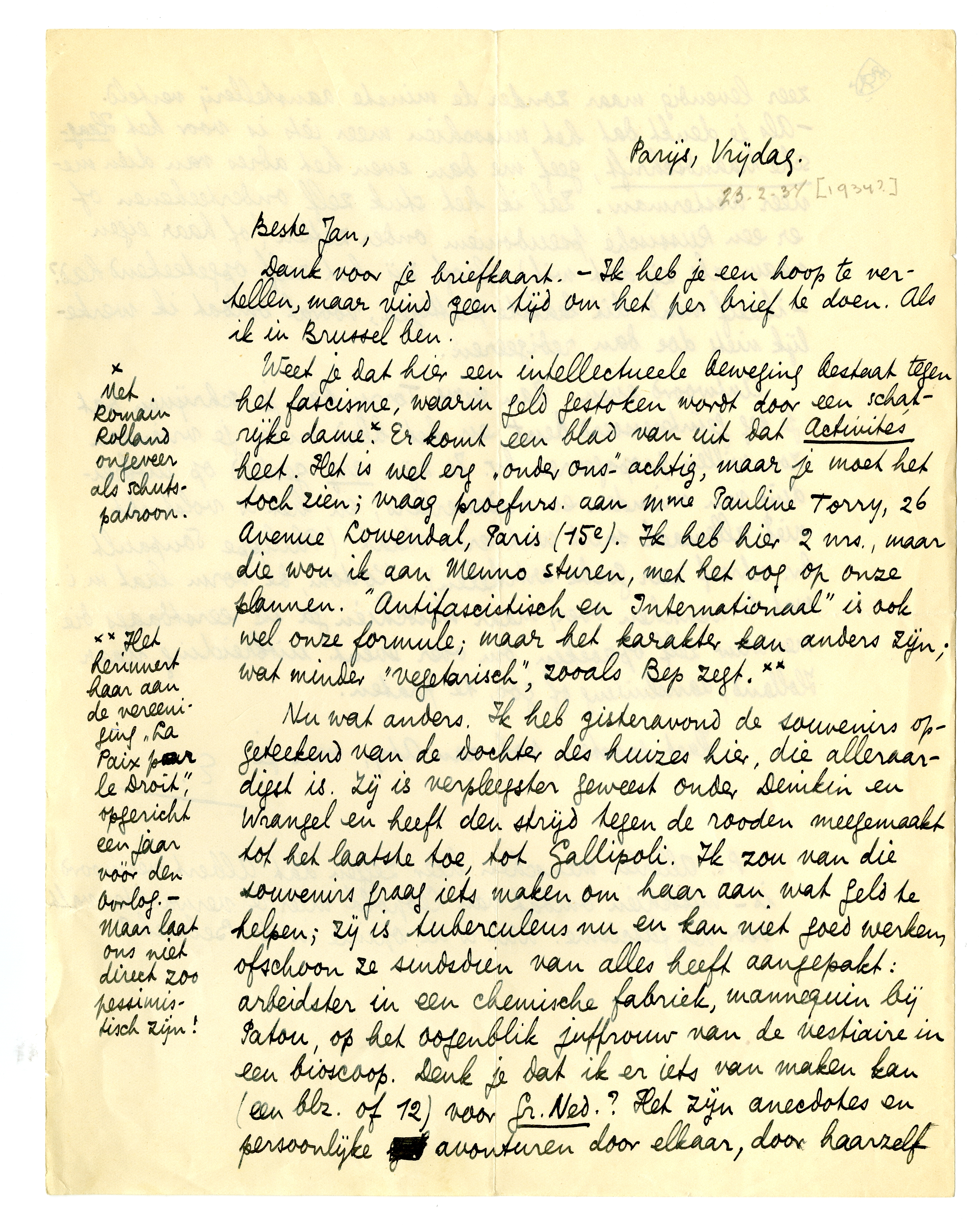 Weet je dat hier een intellectueele beweging bestaat tegen het fascisme, waarin geld gestoken wordt door een schatrijke dame.* Er komt een blad van uit dat Activités heet. Het is wel erg ‘onder ons’-achtig, maar je moet het toch zien; vraag proef nrs. aan Mme Pauline Torry, 26 Avenue Lowendal, Paris (15e). Ik heb hier 2 nrs., maar die wou ik aan Menno sturen, met het oog op onze plannen. ‘Antifascistisch en Internationaal’ is ook wel onze formule; maar het karakter kan anders zijn; wat minder ‘vegetarisch’, zooals Bep zegt.3090