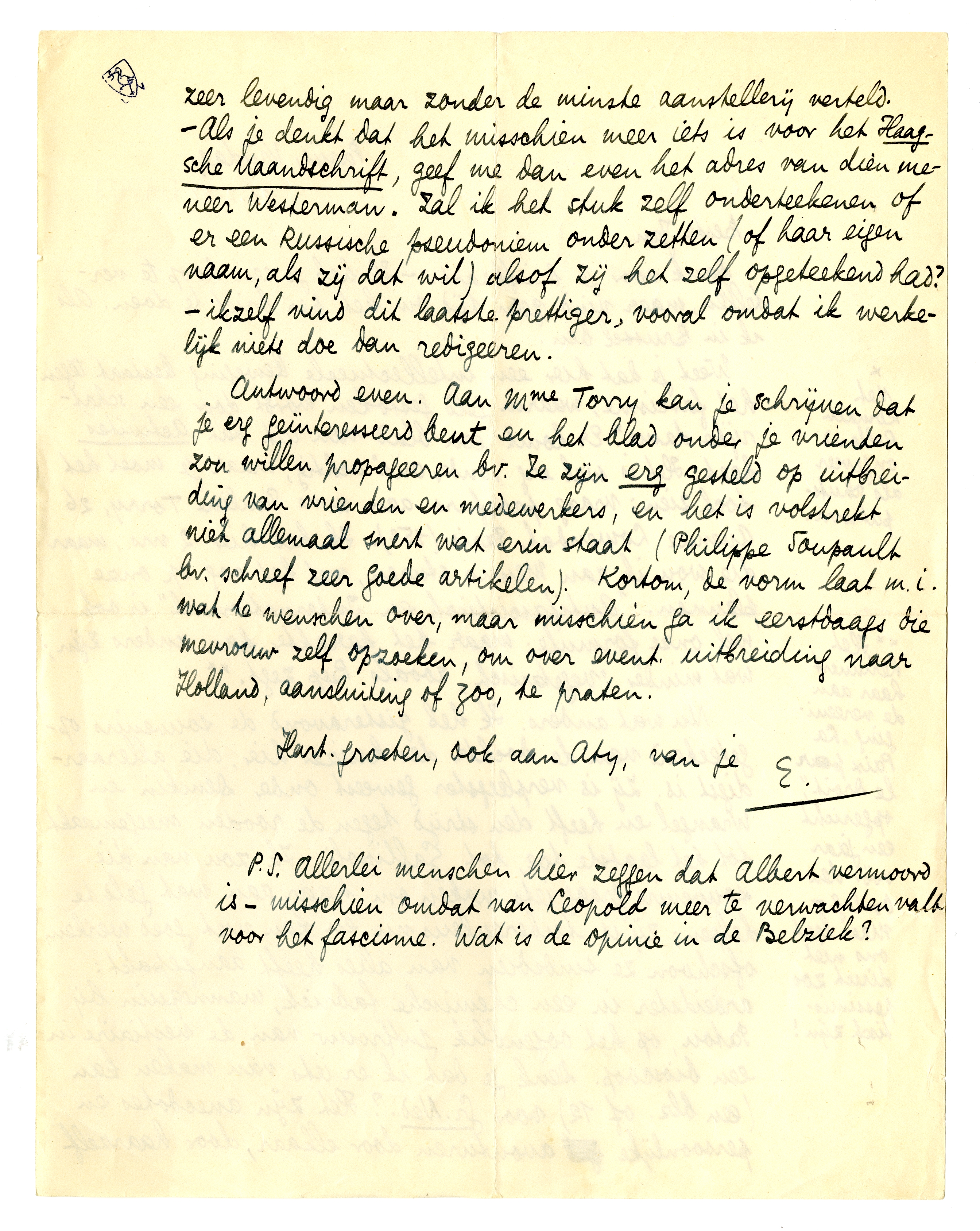 Antwoord even. Aan Mme Torry kan je schrijven dat je erg geïnteresseerd bent en het blad onder je vrienden zou willen propageeren bv. Ze zijn erg gesteld op uitbreiding van vrienden en medewerkers, en het is volstrekt niet allemaal snert wat erin staat (Philippe Soupault bv. schreef zeer goede artikelen). Kortom, de vorm laat m.i. wat te wenschen over, maar misschien ga ik eerstdaags die mevrouw zelf opzoeken, om over event, uitbreiding naar Holland, aansluiting of zoo, te praten.