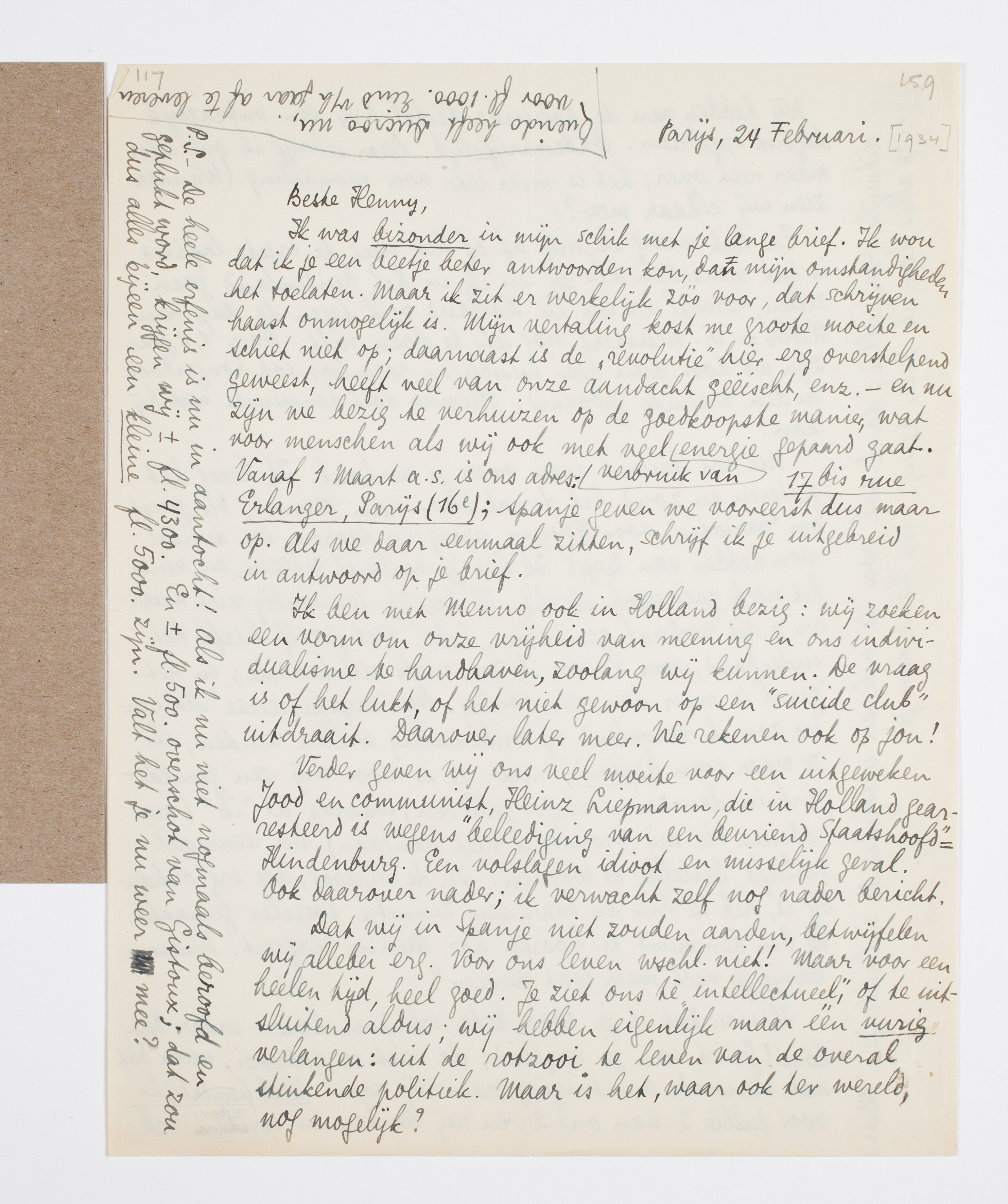 Ik was bizonder in mijn schik met je lange brief. Ik wou dat ik je een beetje beter antwoorden kon, dan mijn omstandigheden het toelaten. Maar ik zit er werkelijk zóó voor, dat schrijven haast onmogelijk is. Mijn vertaling kost me groote moeite en schiet niet op; daarnaast is de ‘revolutie’ hier erg overstelpend geweest, heeft veel van onze aandacht geëischt, enz. - en nu zijn we bezig te verhuizen op de goedkoopste manier, wat voor menschen als wij ook met veel verbruik van energie gepaard gaat. Vanaf 1 Maart a.s. is ons adres: 17 bis rue Erlanger, Parijs (16e); Spanje geven we vooreerst dus maar op. Als we daar eenmaal zitten, schrijf ik je uitgebreid in antwoord op je brief.