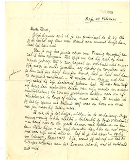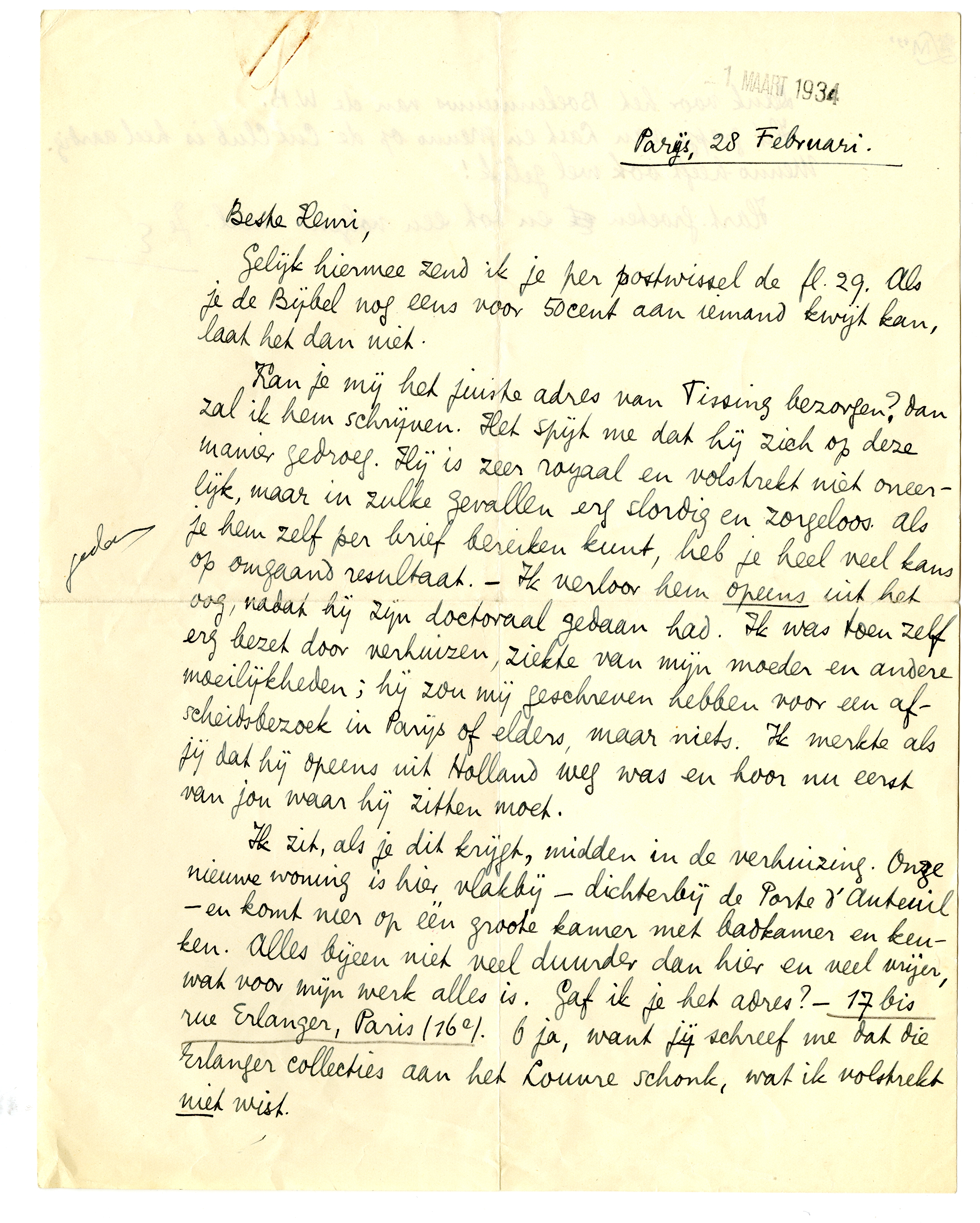 Ik zit, als je dit krijgt, midden in de verhuizing. Onze nieuwe woning is hier vlakbij - dichterbij de Porte d'Auteuil - en komt neer op één groote kamer met badkamer en keuken. Alles bijeen niet veel duurder dan hier en veel vrijer, wat voor mijn werk alles is. Gaf ik je het adres? - 17 bis rue Erlanger, Paris (16e). O ja, want jij schreef me dat die Erlanger collecties aan het Louvre schonk, wat ik volstrekt niet wist.