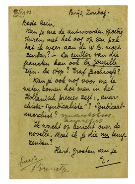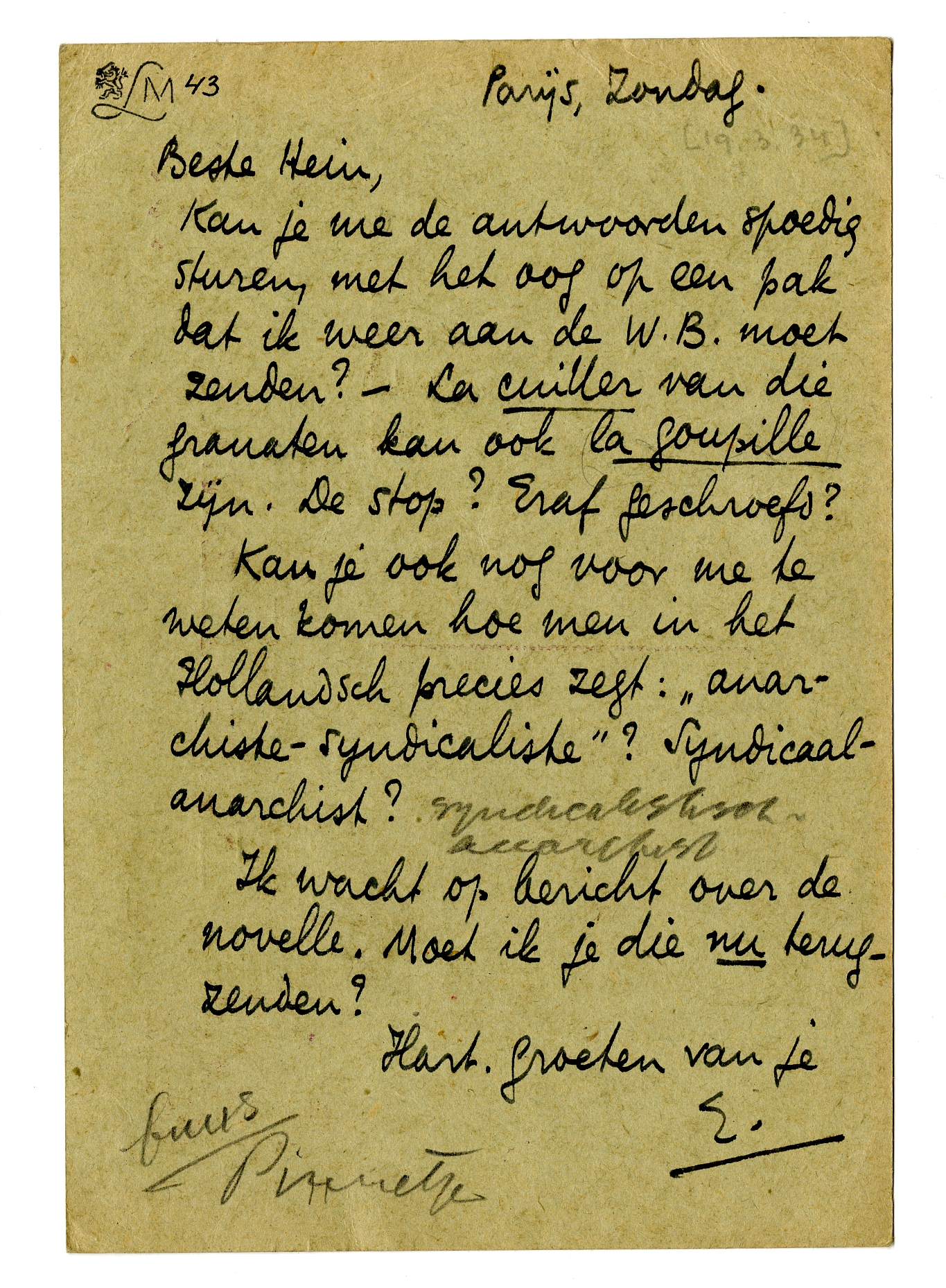 Kan je me de antwoorden spoedig sturen, met het oog op een pak dat ik weer aan de W.B. moet zenden? - La cuiller van die granaten kan ook la goupille zijn. De stop? Eraf geschroefd?